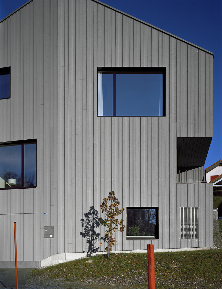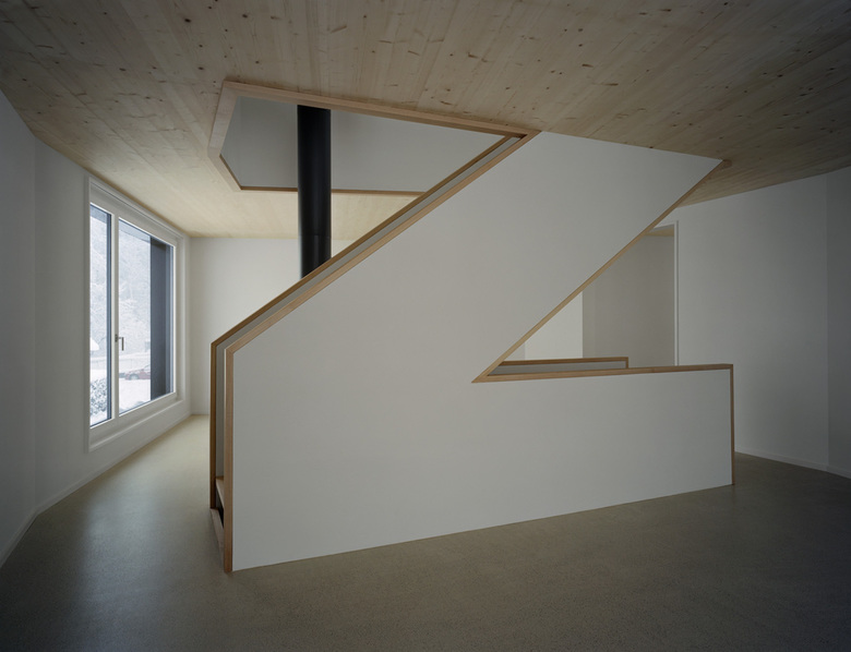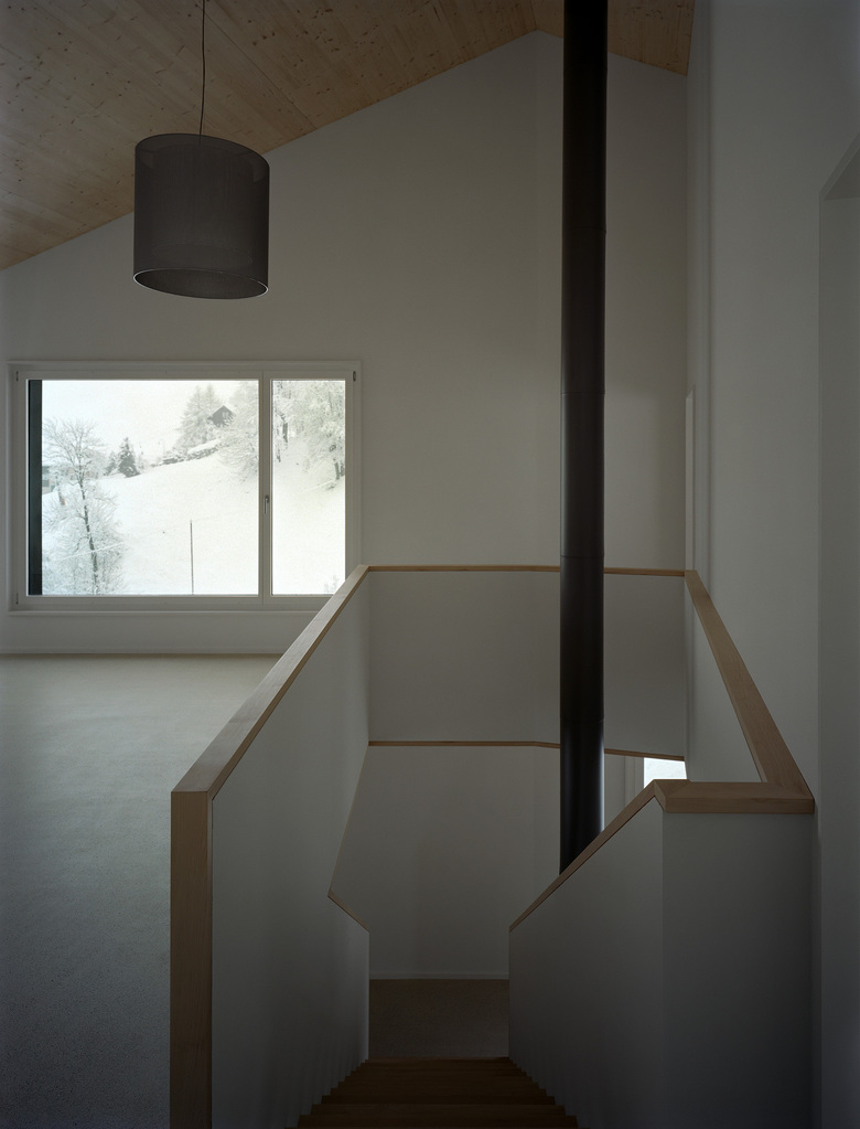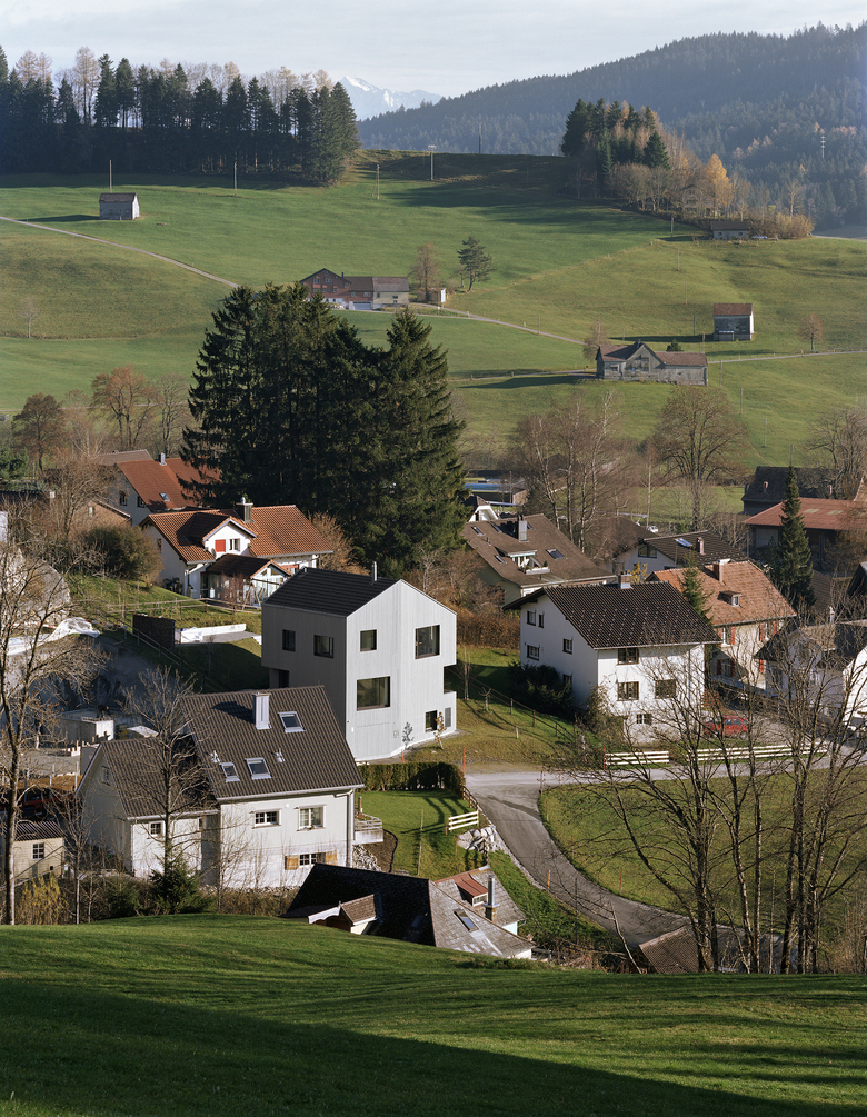 Der Gebäudekörper manifestiert sich in der Magerwiese wie ein kristallines Volumen. Dabei reagieren die abgeknickten Gebäudeseiten auf die spektakulären Ausblicke an das nahegelegene Alpsteinmassiv. Ein geschossübergreifender Wohnraum bildet das grosszügige Zentrum des Hauses. Ein fein detailierter Treppenkörper wirkt darin vertikal als verbindendes Element. Bergseitig flankiert eine durchgängige Schicht sekundärer Räume diesen zentralen Raum. Der Sockel ist massiv betoniert. Darauf aufbauend sitzt in Elementbauweise ein präziser Holzbau aus vorgefertigten Wand- und Dachelementen. Der ganze Gebäudekörper ist mit einer sägerohnen Vertikalschalung aus europäischer Fichte verkleidet.