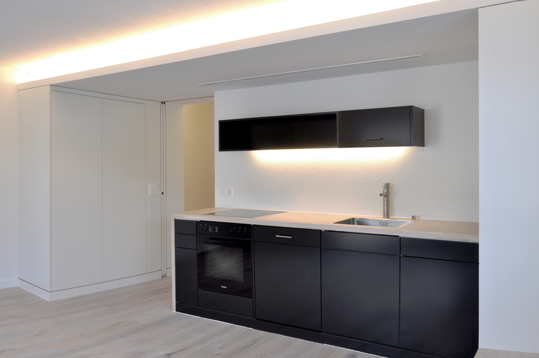 Im Vordergrund dieses Projektes steht das Verknüpfen von verschiedenen Wohnatmosphären; ankommen, ausruhen, kochen, essen. Raumübergreifende Einbauelemente verbinden und separieren zugleich Eingangsbereich und Wohnbereich: Der leicht versetzte Durchgang gibt einerseits Einblick in den Wohnbereich und anderseits schafft er die notwenige Geborgenheit beim Ausruhen auf dem Sofa.