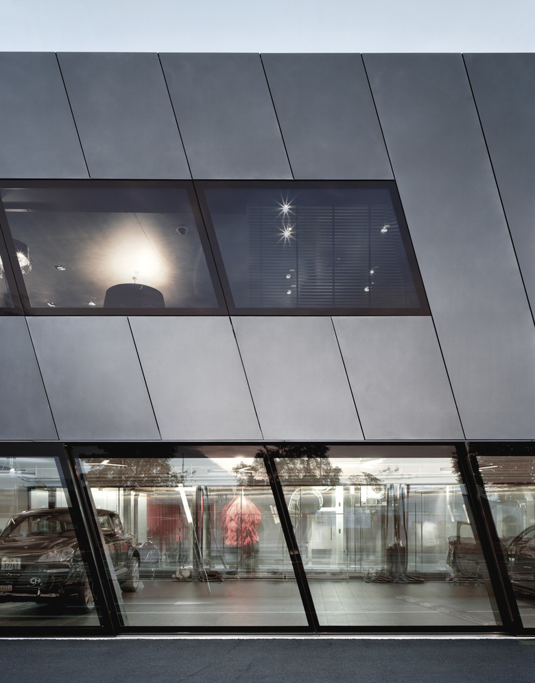 Das neue Gebäude bezieht sich auf den industriellen Charakter des Ortes, die dynamische Form des Autos und den Anspruch von allen Seiten einen unverwechselbaren Auftritt für die Firma Autop zu schaffen. Die skulpturale Form des Gebäudes ergibt sich aus der Symbiose von geometrisch unterschiedlichen Programmelementen, welche sich in einer Hülle vereinen.