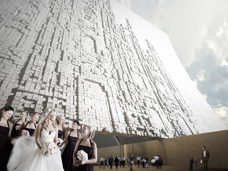 For the faithful, the centuries-old foundation of the world’s great religions is a powerful symbol. Staying vibrant, however, means also viewing that ancient tradition through a contemporary prism. That was the aim of Axis Mundi’s proposal for a new cathedral in Strasbourg, France. The foundation, submerged below ground, represents the  Latin cross plan of historic cathedrals: a long nave intercepted by a transept. The façade also evokes Gothic cathedrals with a digitized bas relief depicting abstracted arches, towers and tracery that become more visible as the sun casts shadows on its limestone surface. Behind that façade, however, the familiar arches and groin vaults are replaced with a progression of slanted accordion folds conceived on the soaring scale of Europe’s famously inspiring basilicas. Glass walls between the folds invite in floods of glorious light, which come to rest on a dramatically minimalist altar and pulpit inspired by the basalt columns of Giants Causeway in Northern Ireland. Rising from it is a pure, unadorned bronze interpretation of Christianity’s most enduring emblem: the cross.