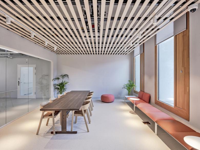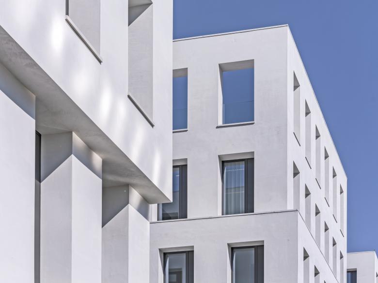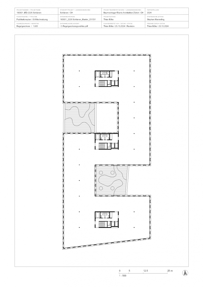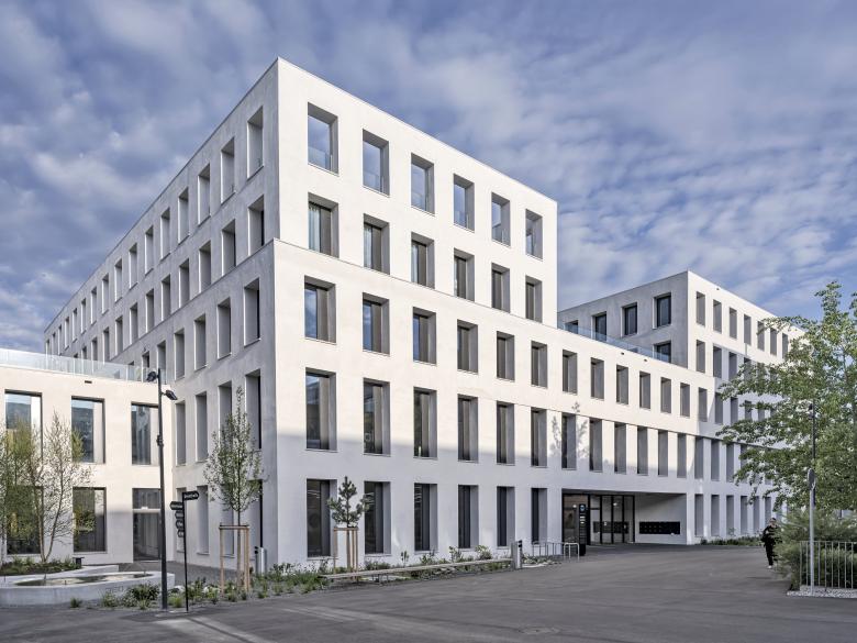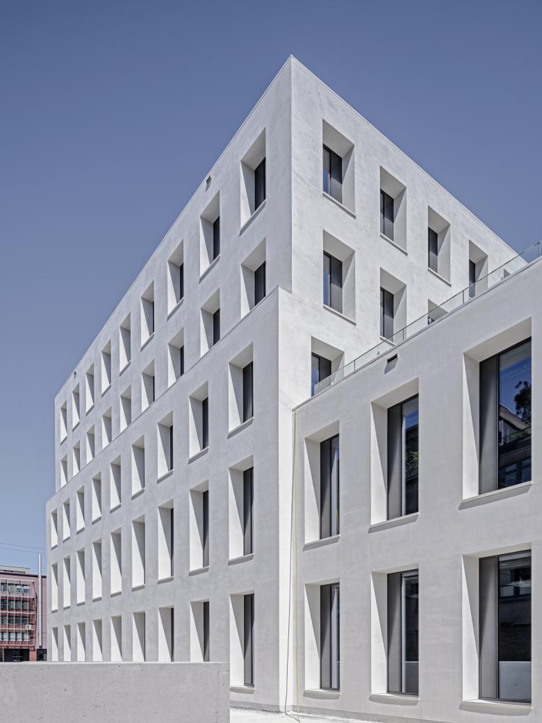 Das Ensemble mit 18.000 Quadratmetern BGF zeigt sich als geschlossener Baukörper mit Einschnitten in den oberen Etagen, die Raum für begrünte Terrassen bieten. Im Parterre sind es die Rücksprünge der Kubatur, die geschützte Freibereiche entstehen lassen. Dem Raumfluss außen steht die maximale Nutzungsflexibilität im Inneren gegenüber. Lediglich Außenwände aus Ziegel, Säulenreihen und die Erschließungskerne bilden eine Primärkonstruktion, die als Rahmenwerk für nutzungsneutrale Arbeitsflächen dient.