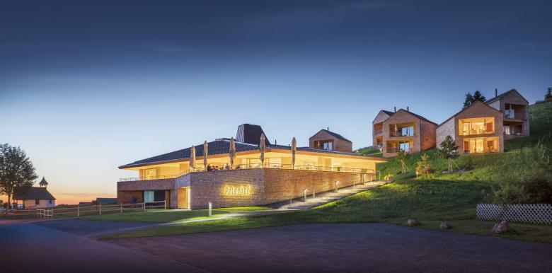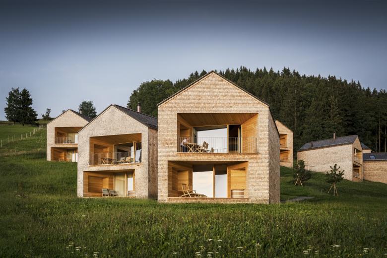 Im Zuge der Planung wurden die Urlaubshäuser in natürlich wirkenden Gruppen und das Haupthaus auf dem Grundstück aufgefächert, damit jedes Gebäude die bestmögliche Aussicht erhält. Platzsparend und daher orthogonal zu den Schichtenlinien positioniert, saugen die zweigeschoßigen Chalets mit ihrer trichterähnlich geformten Stirnseite das Landschaftspanorama an. Von Vorteil ist diese Konfiguration in ihrer Ambivalenz, weil sie nicht nur Ausblick bietet, sondern auch vor Einblicken von der Seite zu schützen vermag. Daher ist es konsequent, wenn nun das Versetzen der geschoßhohen Fenster die Axialität der Stirnseite relativiert. Städtebau findet auch auf dem Land statt, so könnte man die Organisation der kleinen Siedlung beschreiben. In Zeiten der Zersiedelung des Alpenraumes ein umso wichtiger Aspekt dieses Projekts. Die primäre Botschaft der Architektur, nämlich Struktur und Aussicht zu optimieren, wird mit ergänzenden Themen konjugiert: Tatsächlich und sehr bildhaft beschützt das überragende Dach, es nimmt den gesamten ersten Stock bis zum Fenstersturz ein, wobei eine weitere Öffnung nach oben hin, den Fernblick aus der Horizontalen in die Vertikale überträgt. Diese Laterne erfüllt das Obergeschoß mit natürlichem Licht, bewirkt aber noch mehr: Das Licht unterstützt die Plastizität des Daches und streicht über das Relief des verwendeten Materials - Holz. Damit wird wieder eine kleine Irritation eingebracht, ist doch die Verwendung des natürlichen Werkstoffes produktionsbedingt nicht die erste Wahl, wenn es darum geht das Körperhafte der Architektur herauszuarbeiten. Der Dialog von Licht und Material wird auf eine subtile Ebene transformiert, sodass das oft Plakative des Bauens in den Bergen in den Hintergrund rückt. Die grundlegende Komplexität, welche Baumschlager Eberle Architekten mit den kleinen Chalets herausgearbeitet hat, «funktioniert» im größeren Maßstab beim Haupthaus, das als Orientierungspunkt in der Landschaft wirkt.