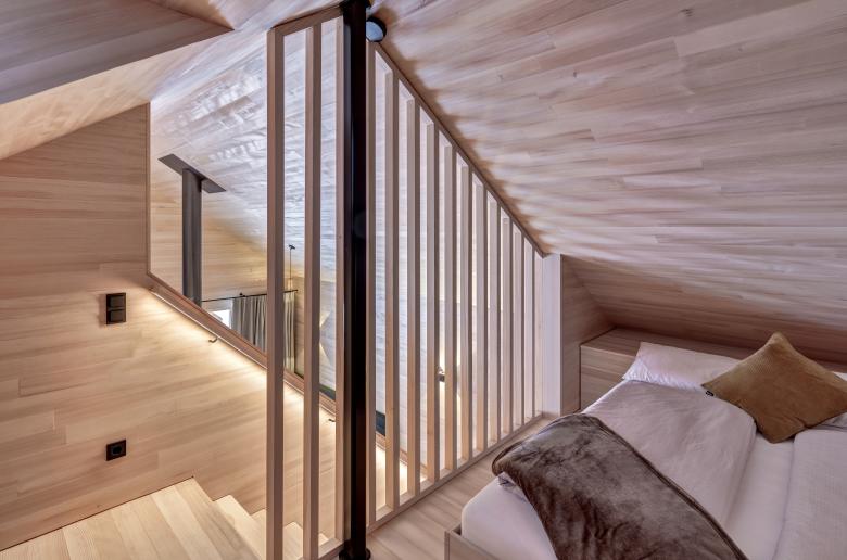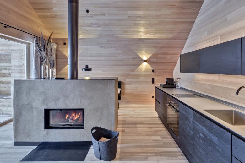Apropos reden: Dabei kommen die schalldämpfenden Eigenschaften des Werkstoffes Holz zur Wirkung. Restaurant und Chalets verfügen über denselben Mix an Holzsorten, für den Boden wurde strapazierfähige Esche und an den Wänden die helle Silbertanne verwendet. Beiden gemeinsam ist die Holzrahmenkonstruktion über der Erde sowie eine hinterlüftete Schindelfassade.