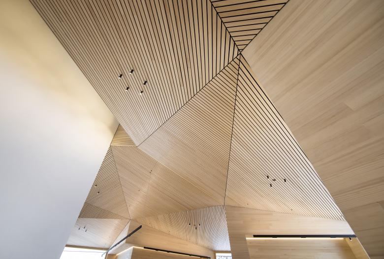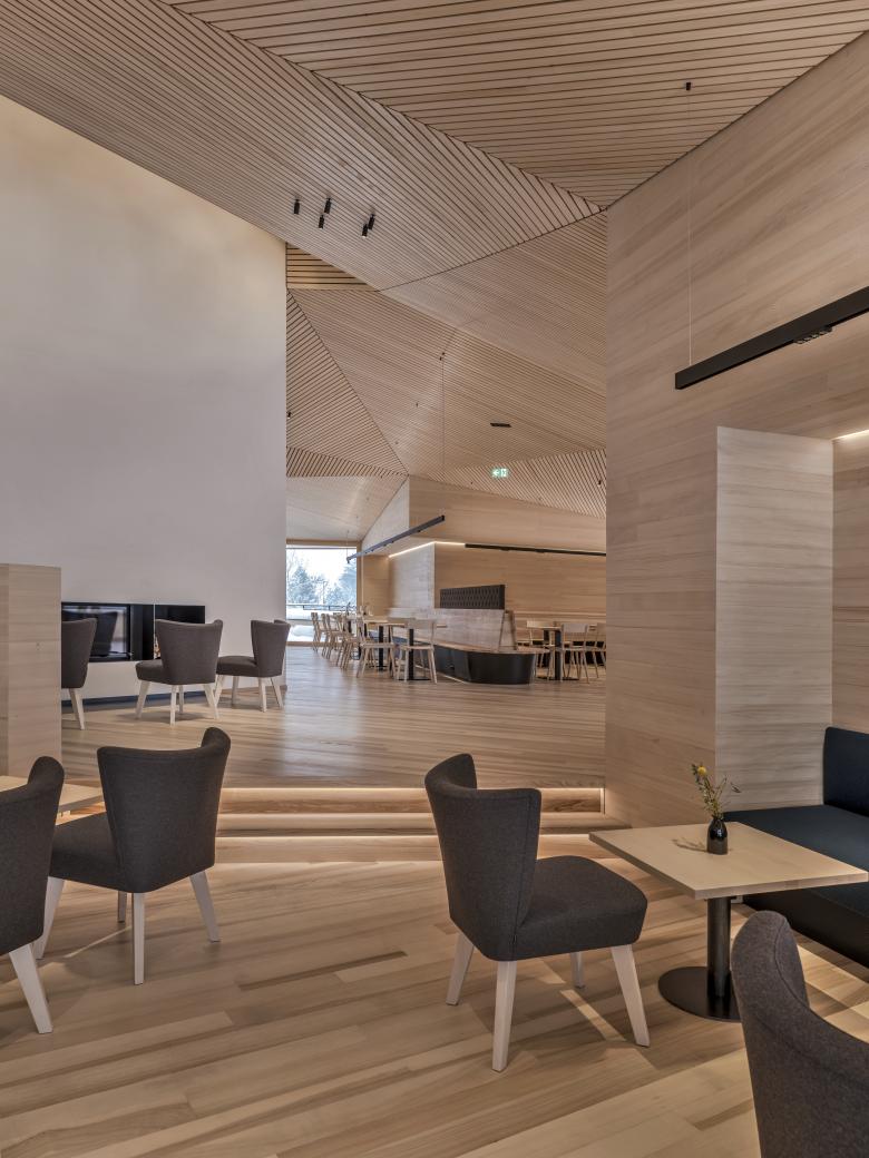 Teils in den Hang geschoben, bildet das erste OG mit dem Restaurant samt Terrasse die Hauptebene des Gebäudes. Die Grundrissorganisation des Restaurants verbindet die Überschaubarkeit einzelner Sitzgruppen mit dem Erlebnis des gesamten Raumes. Sternförmig sind diese Sitzbereiche um die Mitte angeordnet und verfügen über Blickkorridore nach außen hin. Der gesamte Raum bleibt dennoch wahrnehmbar, weil keine Stützen den Blick in die Runde behindern. Auf diese Weise bleibt die große Dimension des Restaurants gewahrt, erfüllt aber auch einen praktischen Zweck – bei Veranstaltungen sind die Redern*innen von überall sichtbar.