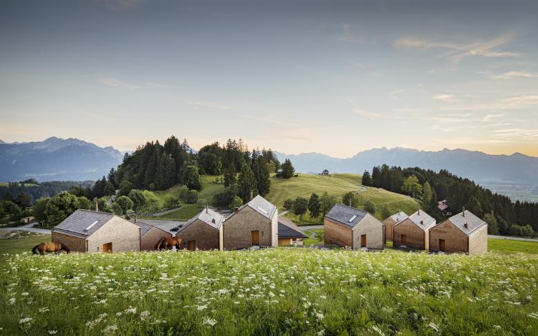 Über dem Vorarlbergischen Rheintal gelegen, machen sich im Naherholungsgebiet der Alpe Furx die jahrzehntelangen touristischen Interventionen bemerkbar. Als Zeichen zunehmender Sensibilität für die berührte Landschaft wurden drei Architekturbüros eingeladen, um Pläne für 10 Chalets und ein Haupthaus mit Restaurant samt Einliegerwohnung auf dem stark ansteigenden Gelände zu erhalten. Baumschlager Eberle Architekten konnten mit ihrem Entwurf den Bauherren überzeugen.