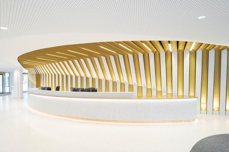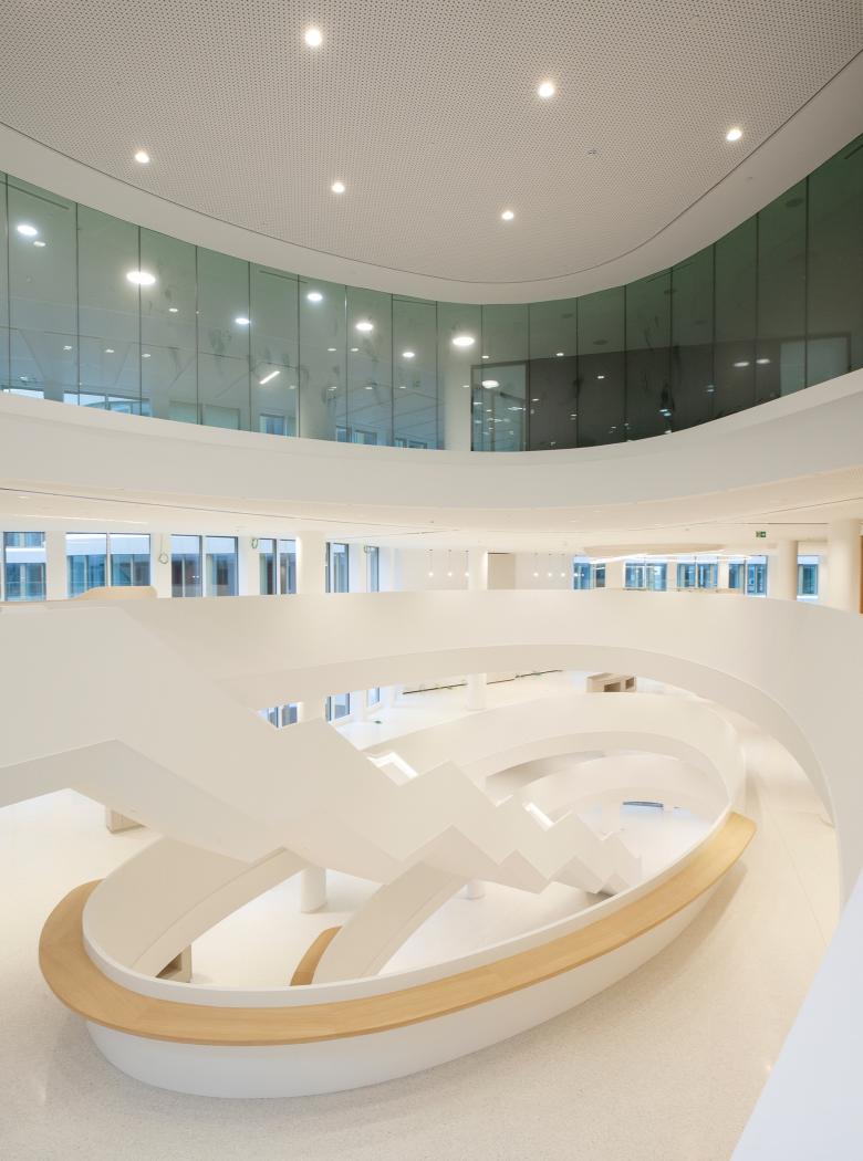 Das Atrium als vertikales Element verbindet vier Geschosse miteinander – und damit die Funktionen Restaurant, temporäres Arbeiten, Treffen, Entspannen. Öffnungen schrauben sich von der Ebene der „unteren Stadt“ auf die Ebene der „oberen Stadt“, auf der sich das Atrium mit einem Bogen zur Esplanade hin fortsetzt. Alles steht in einer balancierten Spannung. Auch im Atrium ist alles auf eine maximale Erfahrung des Raumflusses und möglichst flexible Nutzung hin entwickelt.