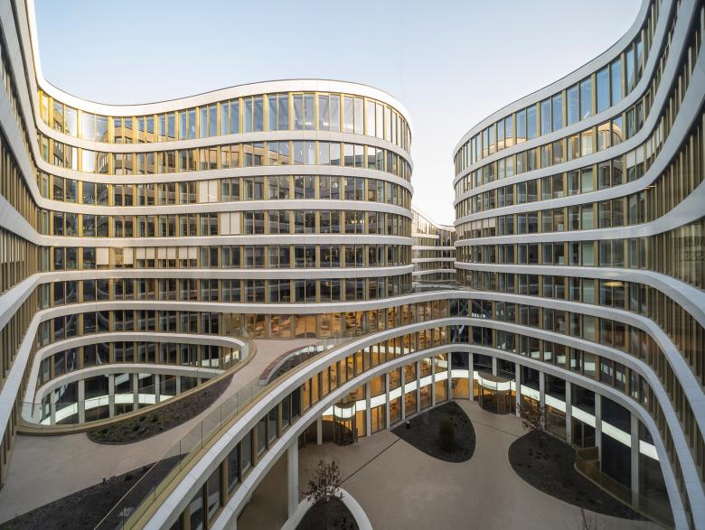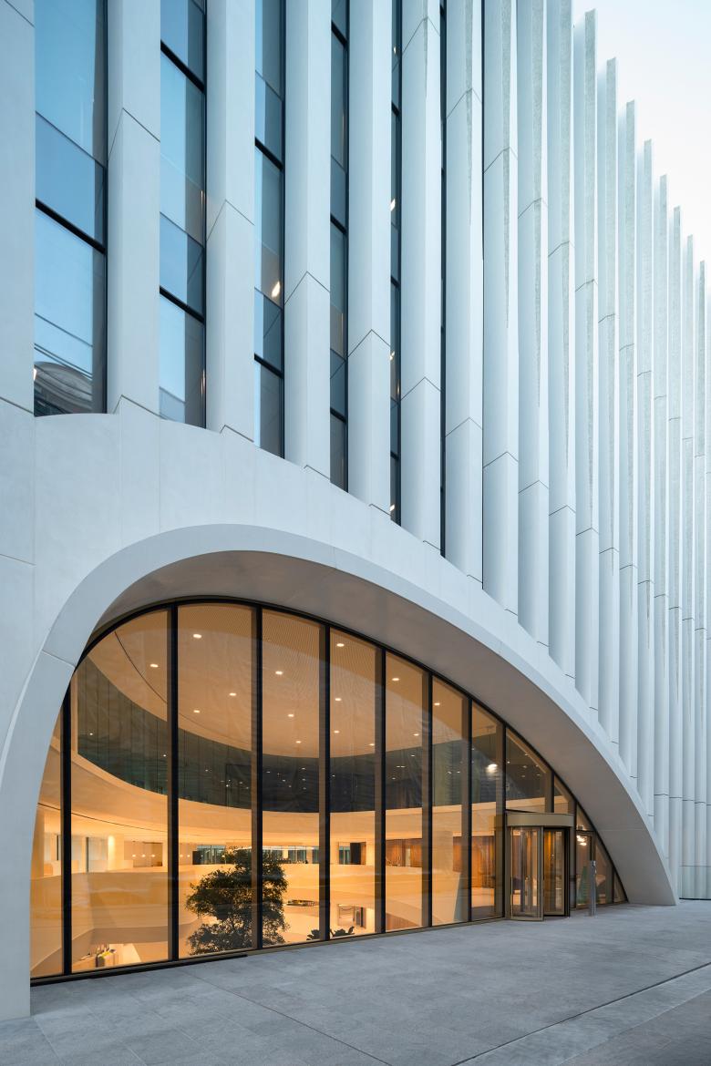 Außen liegende tragende Stützen prägen das Erscheinungsbild des Gebäudes. Das Exoskelett aus 300 Säulen wirkt wie ein umhüllendes Gewand, dessen Muster das Volumen zähmt. Für die polychrome Wirkung sorgt ein grün schillerndes Granulat aus Fuchsit: durch eine Variation des Säulenquerschnitts wird dieses Grün in Teilberei-chen sichtbar. In der frontalen Ansicht zeigen sich die Fassaden als zarte, elegante Tragwerke, in der Halb-Totalen ergibt sich eine Verdichtung der Stützen, die das Thema des Gebäudeverlaufs intensivieren und Gebäudekanten betonen. An den Hoffassaden verstärken horizontale Bänder aus Faserbetonfertigteilen mit einem vertikalen Relief die fließenden Formen und die der Höhenverläufe des Daches; sie wirken zudem als fester Sonnenschutz und beherbergen eine zusätzliche steuerbare Beschattung.