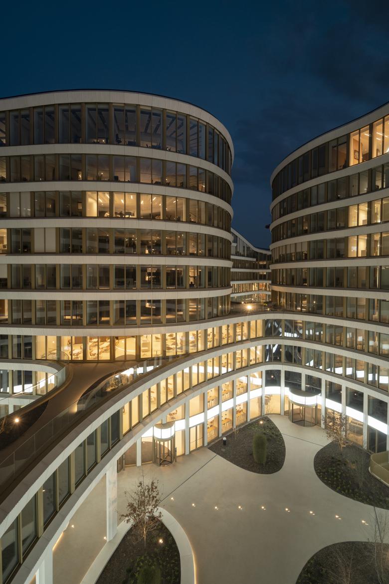 Die Nutzung des bestehenden unterirdischen Volumens als saisonaler Speicher mit 14.000 m3 Wasser trägt maß- geblich zu einem hocheffizienten Betrieb und hohem Komfort bei: azyklisch wird der Speicher im Sommer zur Kühlung verwendet; im Winter ist die auf diese Weise gespeicherte Abwärme für eine angenehme Temperierung nutzbar. Dank der saisonalen Wärmespeicherung benötigt das Gebäude keine fossilen Brennstoffe, und der Ener- gieverbrauch für Kühlung und Heizung beträgt maximal 15 kWH /m² /Jahr, was dem Gebäude das Label „Passiv- haus“ verleiht. Das Dach des Gebäudes mit seiner fließenden Form ist eine grüne Landschaft, weitestgehend frei von technischen Aufbauten: 5.500 m² Lebensraum für Bienen, Vögel und eine große Vielfalt von Pflanzen. Einge- bettet darin sind Photovoltaik-Paneele, die nachhaltig Energie für den Betrieb des Gebäudes und darüber hinaus ihren Beitrag zur Nutzenergie liefern. Noch mehr Grünfläche – etwa 1.400 m² – bietet Montagne du Parc in den Innenhöfen und rund um das Gebäude.