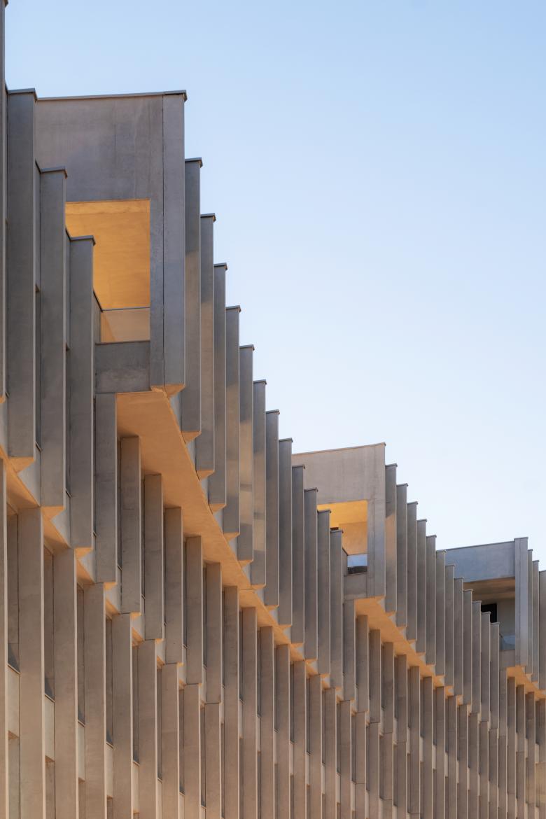 Fassaden mit Präsenz und Funktion, hohe Nutzungsflexibilität: Die Fassaden schaffen eine unverwechselbare architektonische Identität und sind Orientierungspunkt für das Umfeld. Zugleich übernehmen sie klimatische Funktionen: Der helle Ortbeton wirkt städtischen Wärmeinseln entgegen, die Betonvorsprünge auf der Bahnseite tragen im Sommer teilweise zur Verschattung bei und reduzieren den Kühlungsbedarf. Auf der Südseite werden die Fensteröffnungen durch überhängende Kappen geschützt, die hellen Betondorne, welche die Südfassade rhythmisieren, wirken als natürlicher Sonnenschutz. Die Betonstruktur erlaubt große Flexibilität für wechselnde Anforderungen. Basierend auf dem Konzept des freien Grundrisses garantiert das Gebäude Kompaktheit, Modularität und eine Verbindung zur Natur durch die Betonstützenstruktur und die verglasten Rahmen. Das EG als aktiver Sockel ist ein dynamischer Raum, der öffentlich zugänglich, als Treffpunkt für alle funktioniert. Der Zugang zum Garten über einen breiten Durchgang lädt zur Erkundung der Außenbereiche ein. Eine Terrasse entlang der Fassade bietet einen Essbereich, im Herzen des Gartens stehen bequeme Außenmöbel bereit.