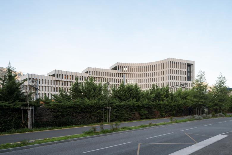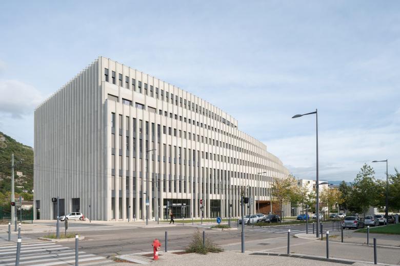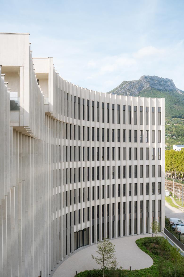 Die Ziele: In unmittelbarer Nähe des Bahnhofs und des Geschäftsviertels Europole sollte ein neues Bürogebäude entstehen – mit unverwechselbarer Architektur und zeitgemäßer Konzeption der Büroflächen. Die Umsetzung: Seine Lage macht das Gebäude zur Nahtstelle zwischen dem Viertel Europole und den zukünftigen Bauten der Stadterneuerung. Sichtbar von den Bahngleisen aus, fügt sich das Gebäude harmonisch ins urbane Umfeld ein und bietet spektakuläre Ausblicke auf die Landschaft um Grenoble. Die gebogene Fassade erstreckt sich über 110 m entlang der Straße und hat großzügige Terrassen vom EG bis zum 6. OG geschaffen. Die Merkmale: Die Fassaden prägen das architektonische Erscheinungsbild, übernehmen aber auch klimatische Funktionen: Der helle Ortbeton wirkt städtischen Wärmeinseln entgegen, Betonvorsprünge, überhängende Kappen und helle Betondorne tragen zur Verschattung bei. Die Betonstruktur gewährleistet außergewöhnliche Flexibilität für wechselnde Anforderungen und eine Verbindung zur Natur durch die Betonstützenstruktur und die verglasten Rahmen. Das EG als aktiver Sockel ist ein dynamischer Raum, der öffentlich zugänglich, als Treffpunkt für alle funktioniert. Eine Terrasse entlang der Fassade bietet einen Essbereich, im Herzen des Gartens stehen bequeme Außenmöbel bereit.