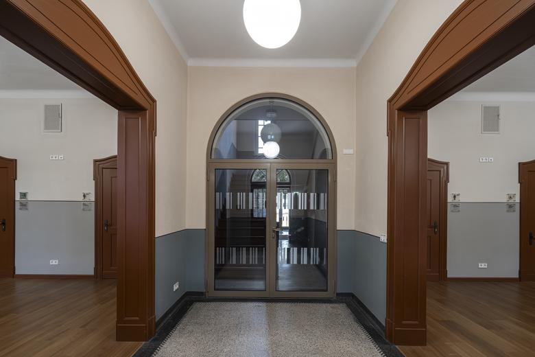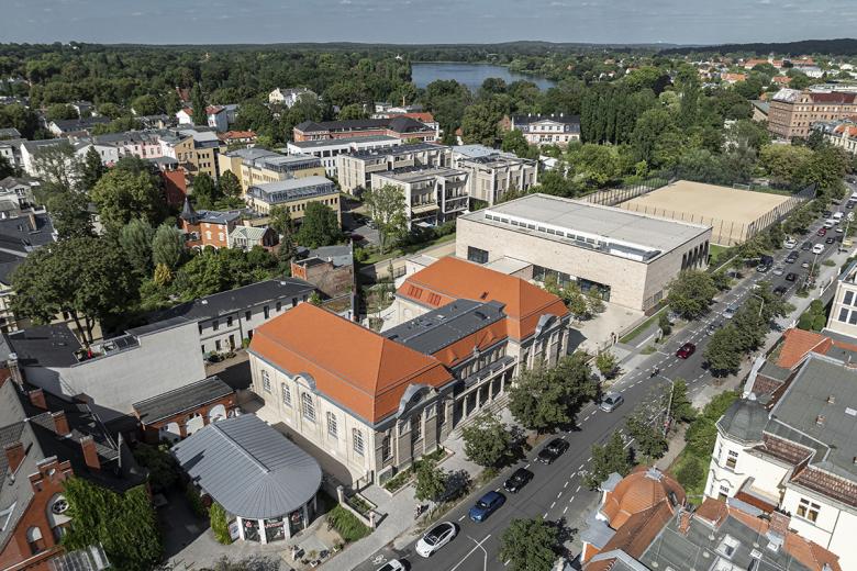 Die um 1910 errichtete, historische Sporthalle in der Kurfürstenstraße 49 ist ein Stadtbild prägendes, repräsentatives Gebäude in der Potsdamer Innenstadt. Als Einzeldenkmal unterliegt es denkmalrechtlichen Anforderungen. In die Baumaßnahme inbegriffen ist der Rückbau von nicht bauzeitlichen Anbauten. Hierzu gehören das Heizhaus inkl. Schornstein, der hofseitige Sanitärtrakt sowie eine Garage. Hierbei wird die Bebauung des rückwärtigen Innenhofes stark reduziert, das Hauptgebäude in seiner Exponiertheit wieder gestärkt und eine ansprechende und funktionale Hofgestaltung ermöglicht, die im Zusammenspiel mit dem benachbarten Hallen-Neubau und seinen bestehenden Außenanlagen eine Ensemblesituation schafft und erlebbar macht. Um das geforderte Raumprogramm abbilden zu können, wird neben Umbauarbeiten im Bestand ein hofseitiger, eingeschossiger Erweiterungsbau für Geräteräume erforderlich. Dieser wird baulich auf ein nötigstes begrenzt und folgt in der Grundrisskubatur in etwa dem vorherigen, nicht bauzeitlichen Sanitärtrakt. Er bemisst sich in vollständiger Breite des bestsehenden Mitteltraktes mit 14 m, hat eine Tiefe von 6,40 m und eine Attikahöhe von 3,41 m, welche mit der bestehenden Brüstungshöhe der Treppenraumfenster korrespondiert und gleichzeitig eine DIN-konforme lichte Raumhöhe der Geräteräume bietet. Es wurden Grundrissvarianten mit verschiedenen Anordnungen von Nebennutzflächen und Sanitärbereichen im Erd- und Obergeschoss untersucht. Dabei wurde in Abstimmung mit den Nutzern der finale Entwurf mit im EG befindlichen kombinierten Übungsleiter-, Regie- und Erste-Hilfe-Raum sowie Sanitärbereichen für barrierefreie Zugänglichkeit und Gäste herausgearbeitet. Daneben werden im Obergeschoss die Sammelumkleiden für bis zu 2 Schulklassen (60 Schüler) in direkter Nachbarschaft mit den beiden Lehrerzimmern untergebracht. Keller- und Dachgeschoss blieben bei allen entwurfstechnischen Betrachtungen und in Abstimmung mit den Fachplanern den Technikflächen vorbehalten.
