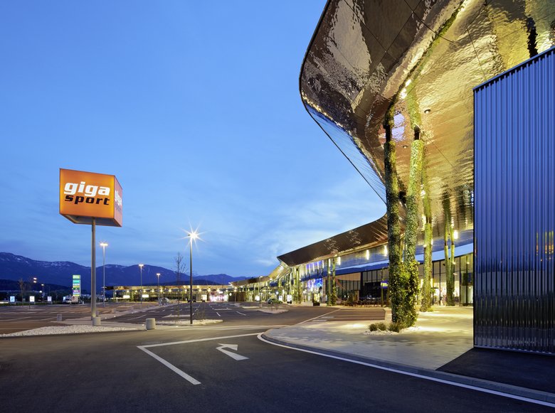 The unusual plantation inspired Austrian artist Franz Graf to create a special floor pattern and facade motifs for the center. The Neukauf Villach features floors that replicate the look of a river and evoke the movement of water. The green pillars look like the trees located in the water which runs below the canopy, slowly flowing into the interior.