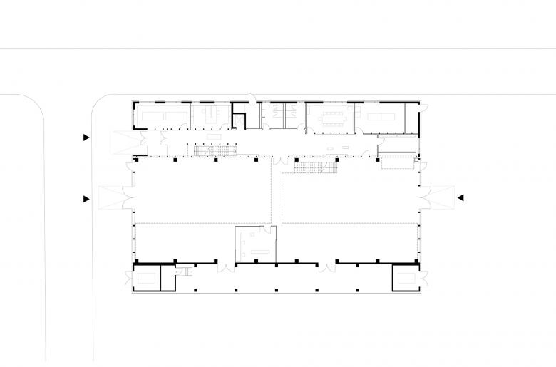 The main approach is from the west via a glass vestibule in the central zone of access, which leads between the offices and the hall, alongside a lightweight glass wall, into the building, allowing generous views between these building sections. The right side opens up onto a hall, while the office spaces are aligned on the left. The control station, the test preparation area, the meeting rooms and the auxiliary rooms are also located here. In the building centre, a stairway and elevator lead to the upper storey, where additional office and preparation rooms are located, as well as a small staff kitchen with seating. The rooms allocated to the test areas are adjacent to the hall atrium and provide direct views into this open space.