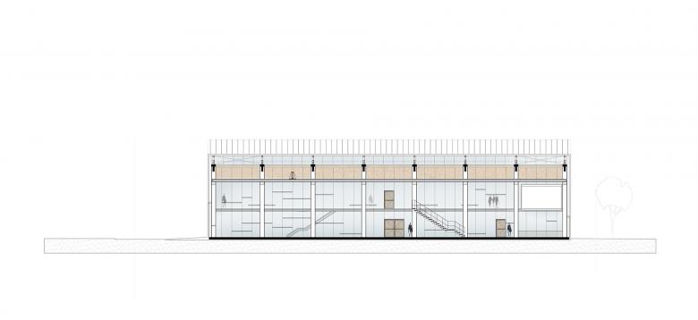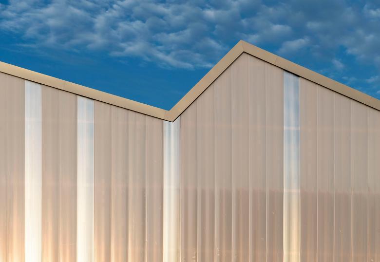 The material of the hall incorporates references to the neighbouring buildings with their industrial character. Window openings set in specific places in the office facade enable a selective illumination of the interior spaces with their unobtrusive design. While here wood and simple glass facades are the dominant design element, the hall is characterized by the polycarbonate facade and the wooden construction of the saw-tooth roof.
