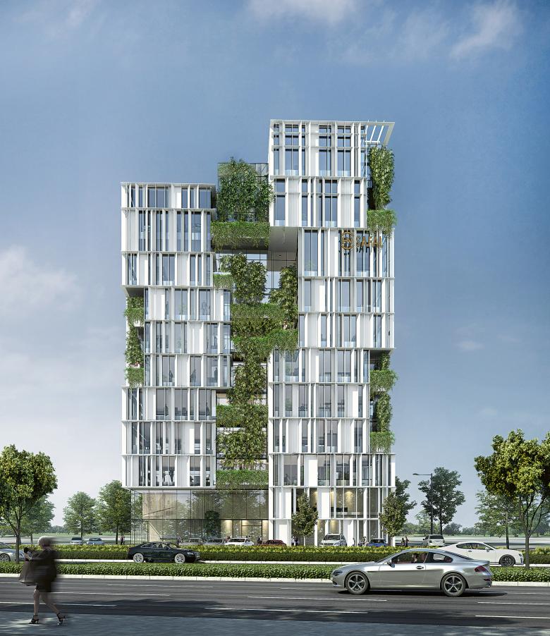 Fast schon monumental erhebt sich das Corporate Building, ein begrünter, vertikaler Spalt stärkt die eindrucksvolle Erscheinung zusätzlich: Der freie Blick, der sich dadurch auf den einzelnen Ebenen ergibt, zeichnet die hohe Aufenthaltsqualität im Innern aus, die die dicht begrünten Terrassen, die sich durch Verschiebungen der Ebenen ergeben, nach außen tragen.