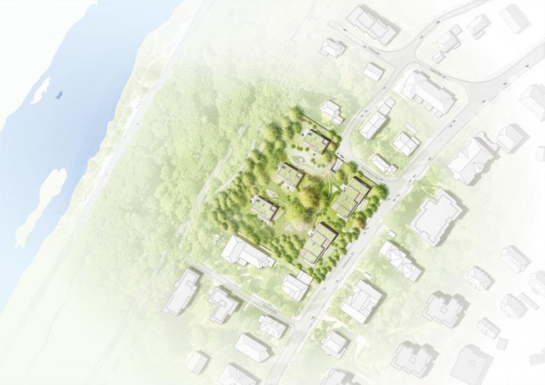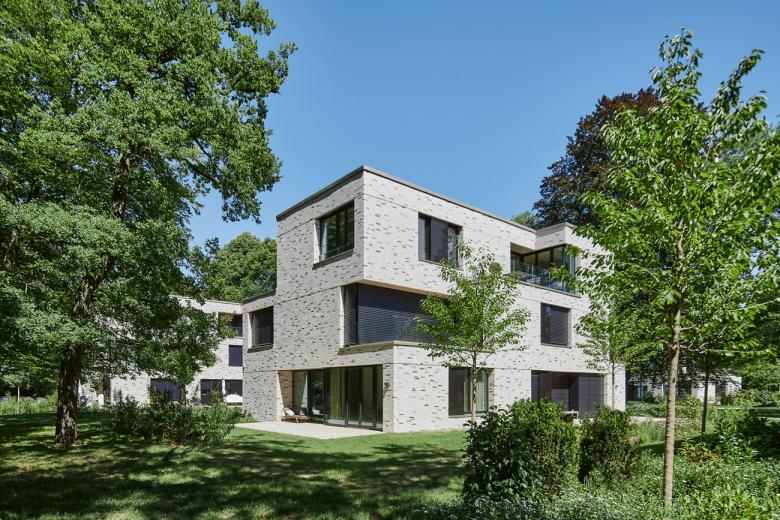 Die Kubatur ist so gewählt, dass der Eindruck entsteht, seine eigene Villa zu bewohnen. Indem die einzelnen Gebäudeteile verschoben angeordnet sind und den Baukörpern in allen Richtungen Volumen genommen wird, entstehen reizvolle Grundrisse und Ecksituationen. Sie generieren vielfältige Blickbeziehungen, gleichzeitig dient die Reduktion der besseren Orientierung in Richtung der umliegenden Freiflächen. Neben der Wohnqualität ist das Verhältnis zwischen Innen und Außen hervorzuheben. Wie Stempel prägen sich die Punkt- und Riegelhäuser sanft in die Gartenidylle ein. Ein mäanderndes Netz aus Wegen hält den Villenpark lose zusammen; ansonsten genießen die späteren Nutzer maximalen Freiraum im Spannungsfeld zwischen Landschaft, Garten und Architektur.