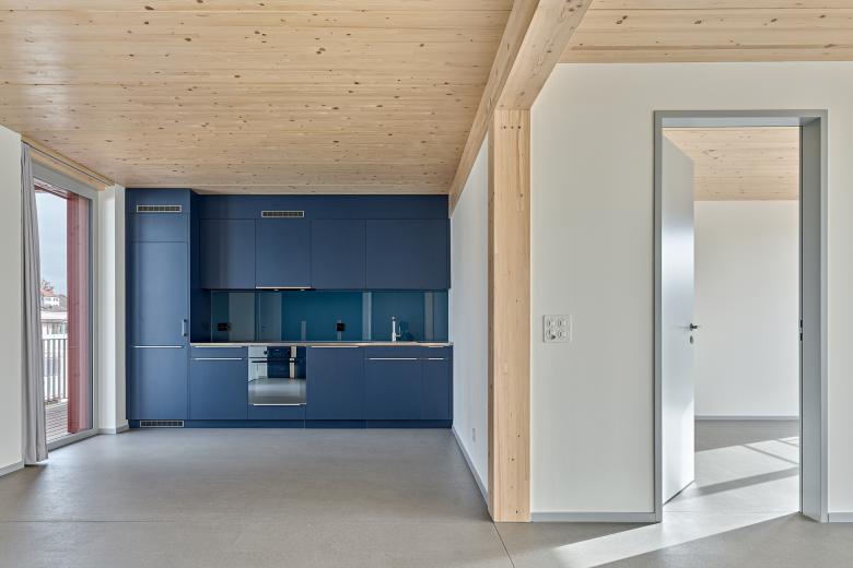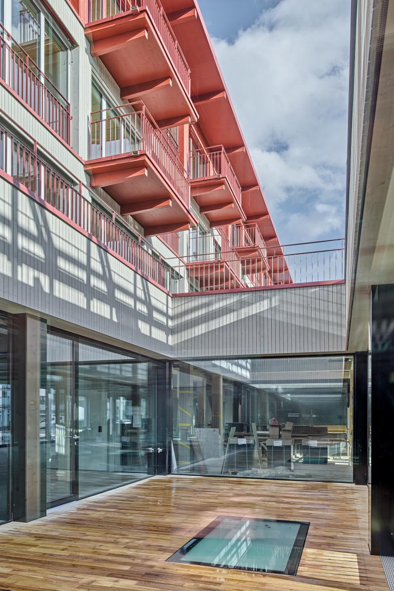 Der Neubau wurde als konstruktiver Holzbau auf einem massiven Untergeschoss konzipiert. Das Erdgeschoss ermöglicht eine flexible Büronutzung, welche in zwei Mietflächen mit gemeinsamen Flächen (Pausenraum, Sitzungszimmer etc.) eingeteilt werden kann. Kleine Aussenhöfe in der Mittelzone belichten die Bürofläche und können als Aussenräume von den Beschäftigten genutzt werden. In den oberen drei Geschossen befinden sich Kleinwohnungen, welche sich mit einem kleinen Balkon nach Süden zu den Geleisen der SBB und Glatttalbahn, sowie nach Norden gegen die Neugutstrasse ausrichten. Erschlossen werden die 24 Mietwohnungen über einen Laubengang, welcher als einer der angedachten Begegnungsorte dem sozialen Austausch unter den Mietern dienen soll. Ein zweiter Begegnungsort befindet sich auf dem Dach über dem Erdgeschoss, welcher mit einem Holzdeck zoniert und einer Pergola gedeckt wird. Dieser Aussenraum bietet sich an für Veranstaltungen und Feste und kann von den Bewohnern sowie den Beschäftigten genutzt werden.