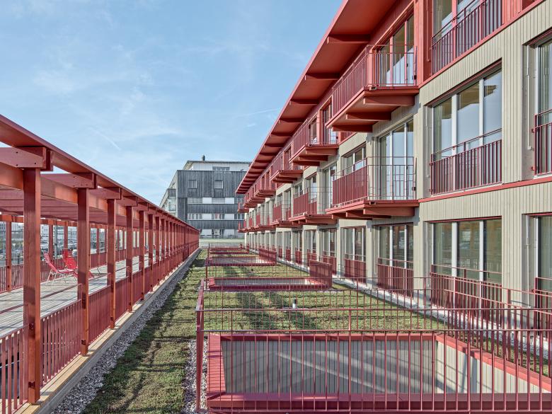 Die Gestaltung der Fassade folgt dem Konzept eines städtischen Holzbaus. Der Einsatz von Farbe und die Detailierung unterstreicht den urbanen Kontext und gibt dem Neubau eine unverwechselbare Identität entlang der Neugutstrasse.