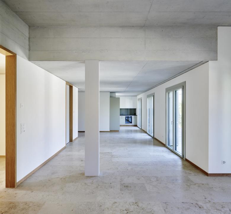 Die Küchen mit Essbereich bilden das Herz der Familienwohnungen in den Regelgeschossen. Ein Lichtschacht versorgt die innenliegenden Küchen mit Tageslicht. Der hofseitige Essbereich mit grosszügiger Öffnung ermöglicht den Blick auf das Treiben im Garten. Dagegen findet sich das ruhigere Wohnzimmer mit vorgelagertem Balkon an der Westseite. Mit kleinen Ausnahmen im Attikageschoss kann das Wohnzimmer mittels Flügel- oder Schiebetüren abgetrennt werden. Die Nassbereiche wurden möglichst zusammengelegt und unweit der Schlafzimmer angeordnet. Bedingt durch die Geometrie des Attikageschosses sind hier die Wohnungen unkonventioneller im Grundriss, umso mehr profitieren sie von den grosszügigen Terrassen und der Aussicht.