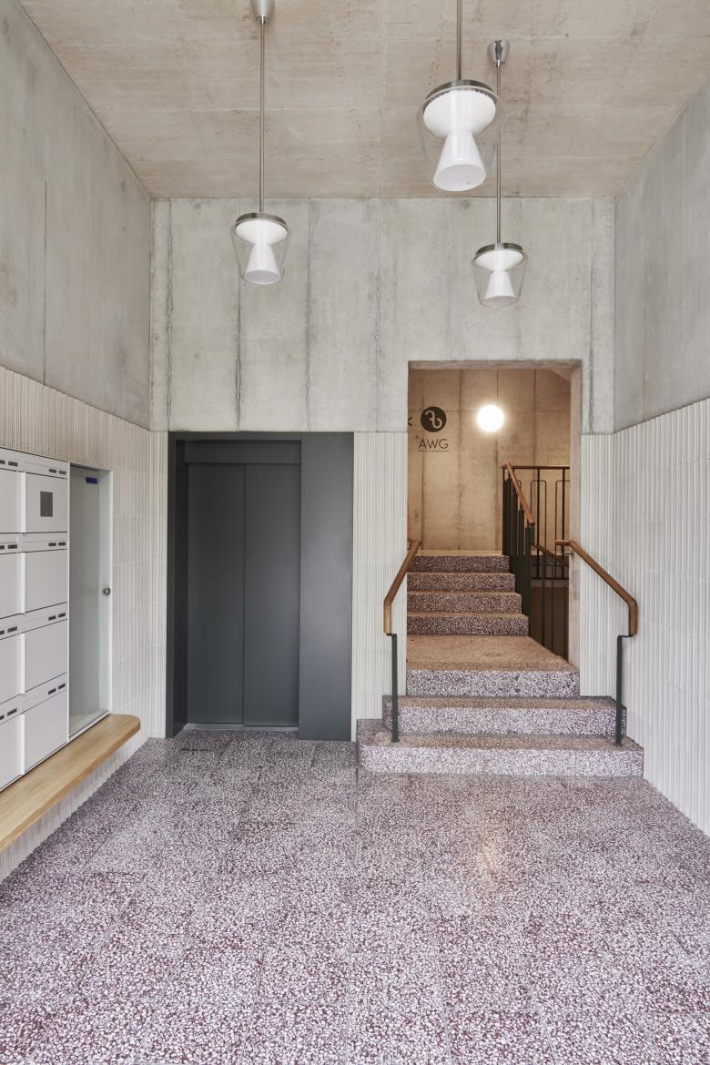 Die Erschliessung der Wohnungen erfolgt über drei gleichwertige Treppenhäuser mit Lift. Durch die beengten Raumverhältnisse im Erdgeschoss werden die Abstellräume und Waschküchen mehrheitlich im Untergeschoss untergebracht. Ein ebenerdiger Kellereingang im südlichen Gebäudeteil bietet hier einen zusätzlichen, schwellenlosen Zugang. Die Gliederung der Nutzungen in Keller, Pflegewohngruppe im Erdgeschoss und drei Wohngeschossen erfolgt horizontal, wobei die Wohngeschosse als Drei- und Vier-Spänner konzipiert sind.