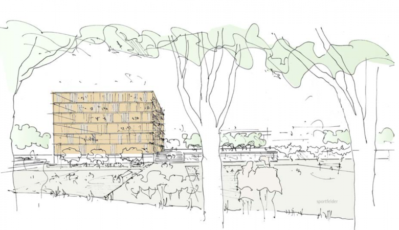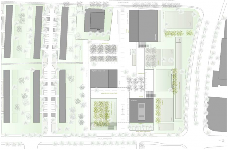 Die verschiedenen Nutzungen werden auf drei Gebäudeteile - Schulturm, Tagheim und Sporthalle als Solitäre angelegt und bestimmen zusammen mit einem Sockelbau, als verbindendes Element, die „neue Schulstadt“. Wesentliches Ziel ist die Schaffung von mehreren Raumfolgen mit unterschiedlichem Charakter, die sich zwischen den einzelnen Baukörpern bilden. Eingänge, Verbindungen, Parkierung und Zugänge zu den Freisportanlagen werden somit Teil des Gesamtkonzeptes.