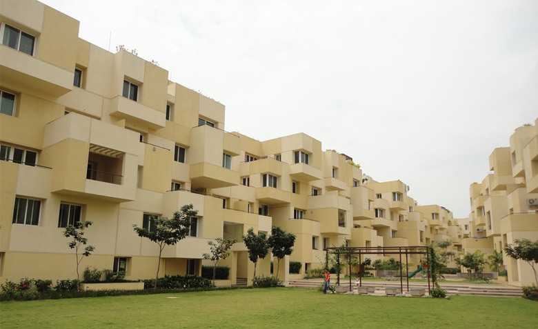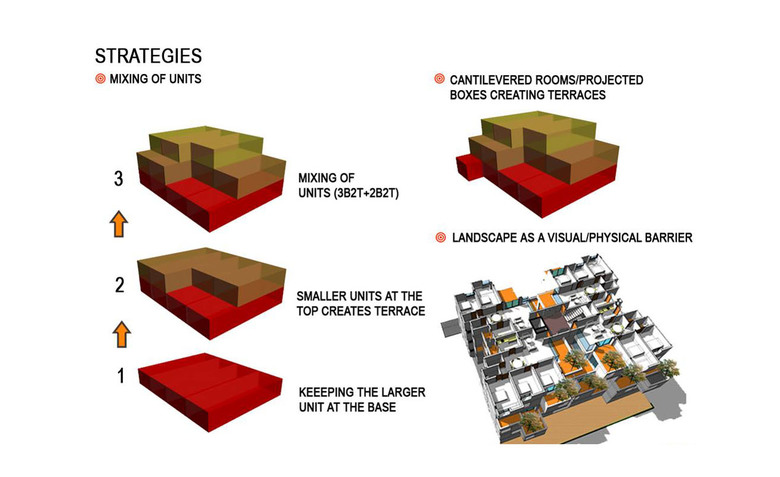 The design challenge seeks to effectively tackle the dense nature of these dwellings, without compromising on the builders economic requirements, yet create a feeling of domesticity and privacy. Each apartment unit is designed with its own landscaped terrace or sit-out space. This series of terrace fronts form a successful buffer between adjacent and opposite blocks, thus making each apartment unit an individual house in itself. The idea of private landscaped terrace is achieved by means of interlock of apartment units, each one uniquely designed and positioned across this four storey complex. Thus a series of landscaped terraces tumble down to the larger central courtyard. The main courtyard is a pedestrian garden, free of motorized traffic, which in turn responds to the open landscape in front of the project.