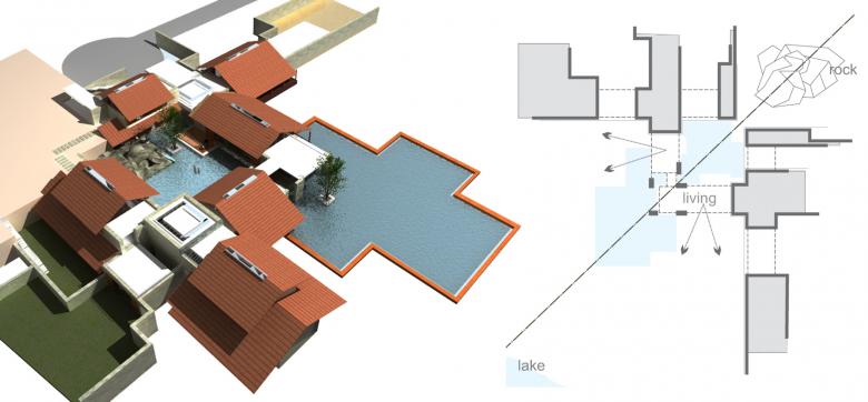 The design takes its cues from the site, building on a view axis that connects a large rock toward the northeast corner with a lake beyond the site towards the southwest. The public zone of the house – containing family room, living room and dining room – is laid out to define a central swimming-pool courtyard against the rock. The family room and living room maintain the view axis by allowing a transparency of views through the building. The house is thus anchored in the landscape along this axis, which links a tower containing a spa pavilion in the northeast corner, the rock, the swimming-pool courtyard, the house, a set of patios, the garden and the lake.