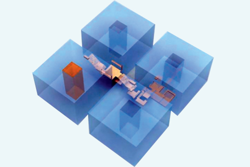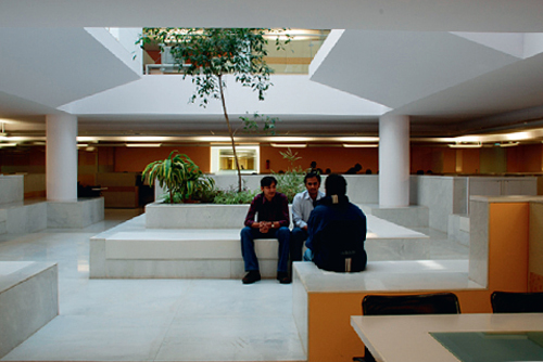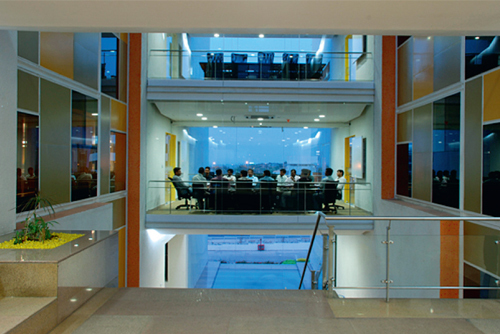 This head office of a software company is a dense development that had to fit 1500 persons on a 1.75 acre site. Vastu (an Indian traditional belief, equivalent to Feng Shui) stipulated that the building be a square with no offsets and projections, and building codes constrained a four floor height limit. The design challenge was to transcend these constraints to provide a sense of scale and community. The project was scaled down by breaking the mass into four quadrants, each containing day-lit office areas wrapped around central sky-lit atriums. This scaled the workforce into smaller teams that still belong to the larger whole. The larger sense of “campus” is infused by the creation of a multi-volume staircase spine cutting through all levels, forming a community “street” where one would encounter the “whole: company. Large skylights, glassed conference rooms, and lift foyers span across this street giving it an outdoor urban feel. The outer surface presents a lightweight Mondrian-like grid of glass and aluminum that interweaves with solid masses in order to break the sense of a box.
