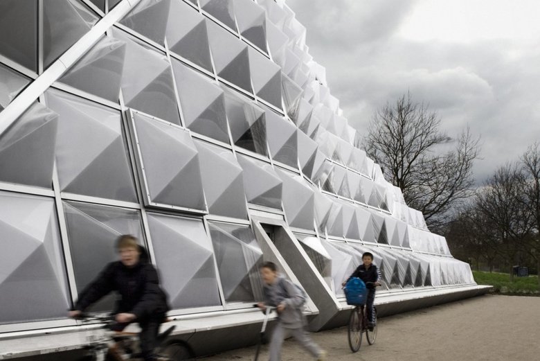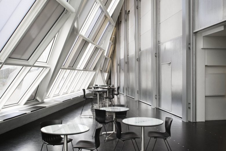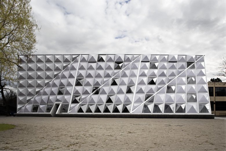 The new facade is conceived as a translucent curtain of acrylic prisms elegantly embracing the existing building, and creating a new open foyer and arrival area. A whole new spatial dimension is added to the building newly connecting the formerly enclosed interior with the outside. Now the theatre visually and spatially connects to both Kjeld Abels Plads north and the protected green courtyard south of the theatre. The facade is assembled from acrylic prisms that vary from totally clear and transparent over translucent to opaque. Because of the many elements of irregular shapes and the variance in translucency, the facade is a beautiful play of shadows and reflections.