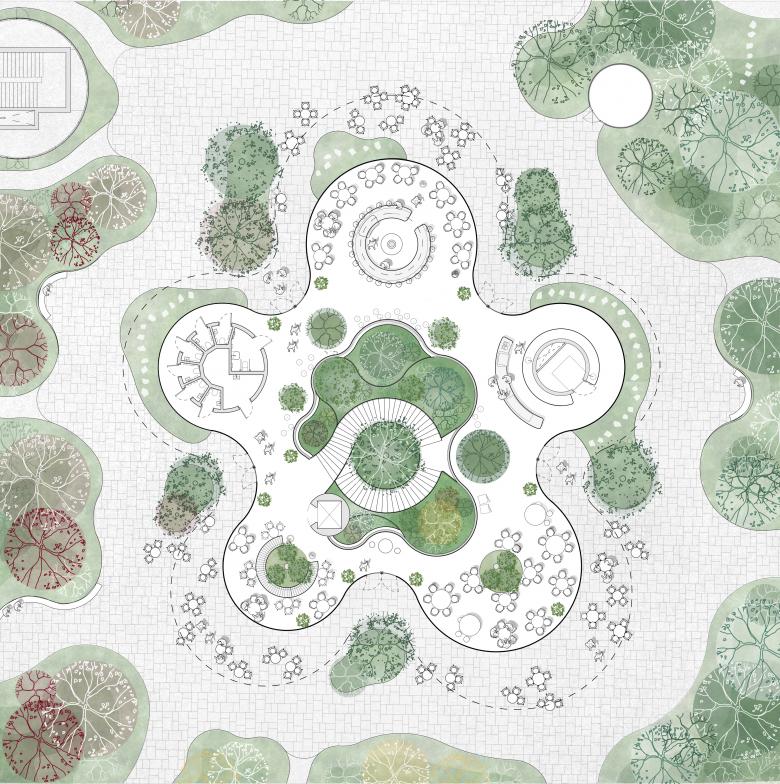In addition to the gardens, the park features a central greenhouse with a café, giving access to car parking underneath the park’s surface. The greenhouse is designed as an organically shaped glass structure with a hovering roof, intended to surprise and delight visitors as they navigate the lush landscape. The greenhouse and café will ensure that The Opera Park remains a vibrant destination year-round, even during winter when many of Copenhagen’s parks are desolate. Inside, the greenhouse terraces down to the parking levels, which accommodate up to 300 cars, while its subtropic biotope also descends to vertically weave together the park with the underground levels.