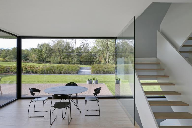 Il se caractérise par certains châssis totalement invisibles (pas d’adaptation de modulation devant les baies) ainsi que des surfaces noires horizontales et verticales pour les volumes extérieures « creusés » dans la masse.