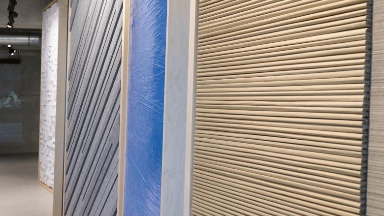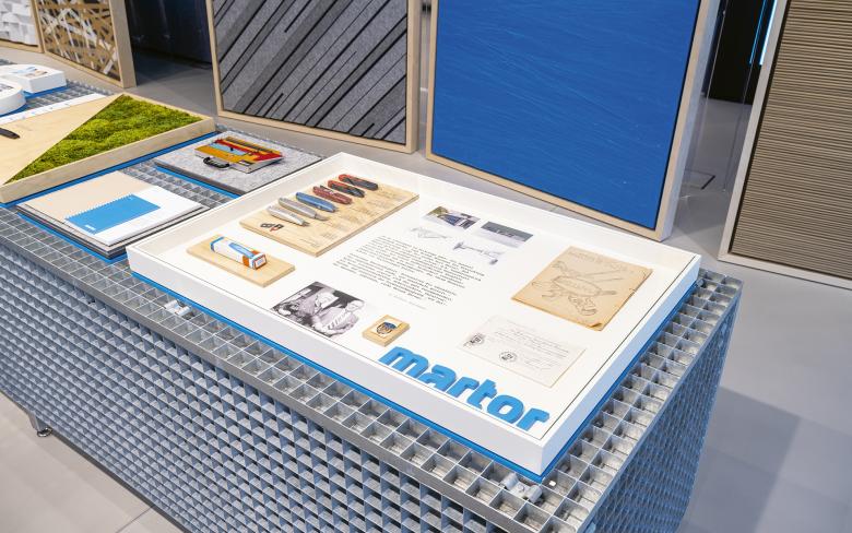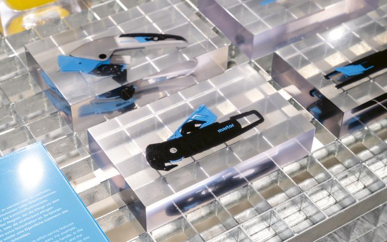 Der Besuch startet im Markenraum. Raumhohe Rahmen, die Material Art Boards, inszenieren die Schneidmaterialien, für die MARTOR Messer entwickelt werden: Kartonpappe, Folie, Klebeband, Umreifungsbänder, Filz und Schaumstoff werden hier zu Kunst erhoben. Soundduschen lassen beim Herantreten das jeweils unverwechselbare Schneidegeräusch erklingen – und schaffen so ein Erlebnis für alle Sinne.