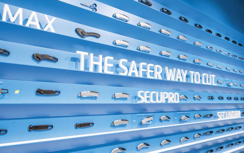 Gegenüberliegend wird in einer beeindruckend großen, cyanfarbigen Wand, der Wall of Fame, das MARTOR-Produktportfolio rund um den neuen Claim „THE SAFER WAY TO CUT“ in Szene gesetzt. Das modulare Wandsystem ist flexibel aufgebaut und kann einzelne Produkte bei Bedarf hervorheben oder um neue ergänzt werden.