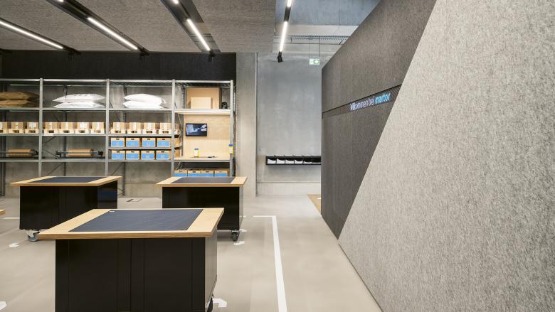 Die Nähe zum Kunden hat für MARTOR einen besonderen Stellenwert – so greift das Konzept die Ästhetik und Materialien aus dem Arbeitsumfeld auf, in dem die Sicherheitsmesser und -scheren zum Einsatz kommen: in den Werkshallen von Industrie, Logistik und Einzelhandel. Estrichboden und sichtbare Gebäudetechnik, ein transparenter Staplervorhang als Raumteiler, Leuchtstoffröhren, Gittertische, Werkbänke und Lagerregale zitieren die Kundenwelt und gehen in die Showroomgestaltung über.