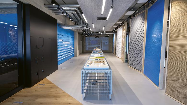 Marken- und Schulungsbereich sind über den Trendbereich verbunden. Dort werden in Wechselausstellungen verschiedene branchenrelevante Trends angesprochen. Aktuell zeigt MARTOR seine Lösungen zum Metathema „Nachhaltigkeit“.