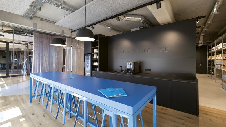 Eine große Projektionsfläche, das Digital Window, am Ende des eindrucksvollen Tisches ermöglicht den Blick hinter die Wände des Showrooms. In ästhetisch ansprechenden Bildern wird der Entstehungsprozess der Produkte gezeigt: von der ersten Idee zum versandfertigen Produkt. Der Betrachter erhält darüber hinaus Einblick in die modernen Arbeitsabläufe und die kollaborative Unternehmenskultur des Unternehmens.