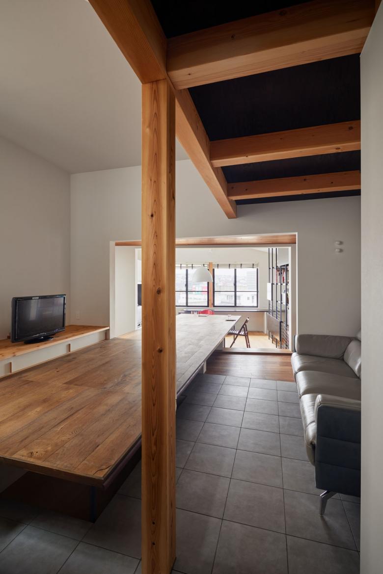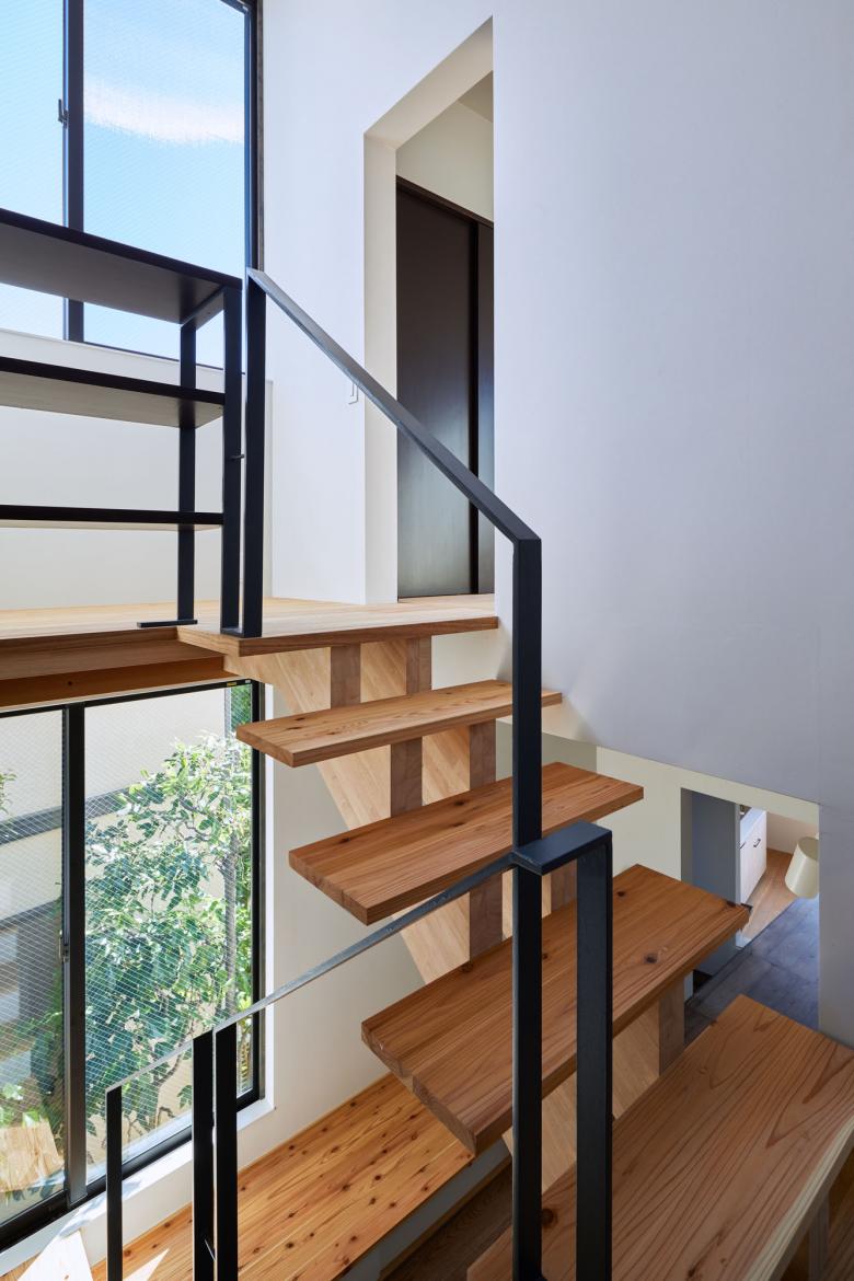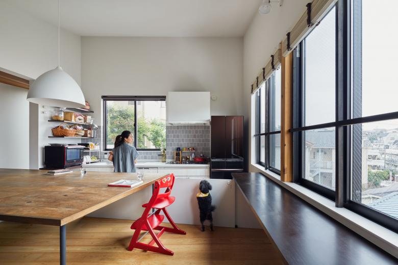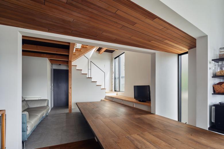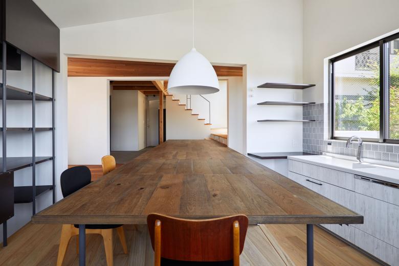 積極的にその擁壁を利用するように高低差のある二つの土地それぞれに小さなボリュームをおき、1階は床のように大きなテーブルで、2階はルーフテラスが2棟を繋いだ。またそれぞれのボリュームは他者が影響し合い、地震の揺れに対する層間変異を許容する工夫が隠されている。