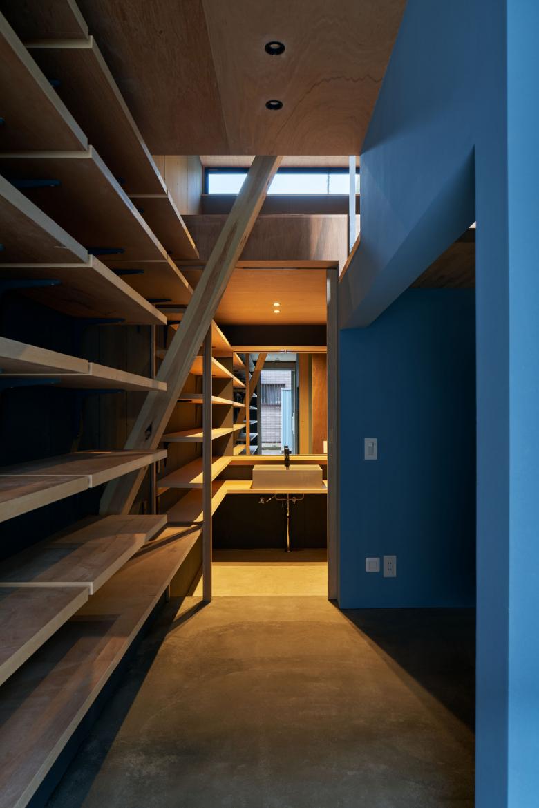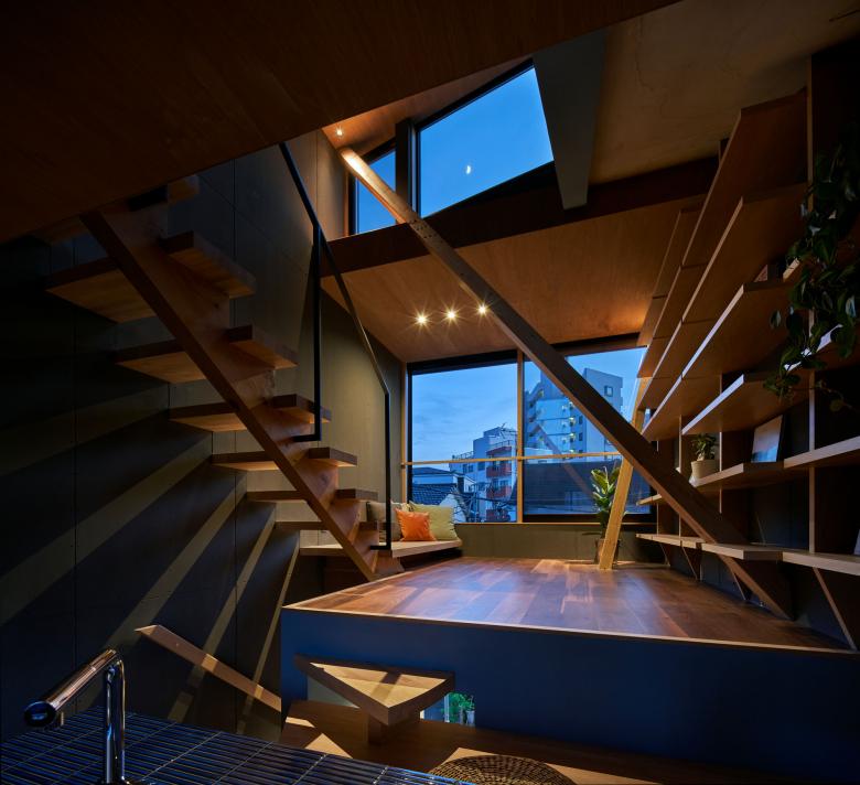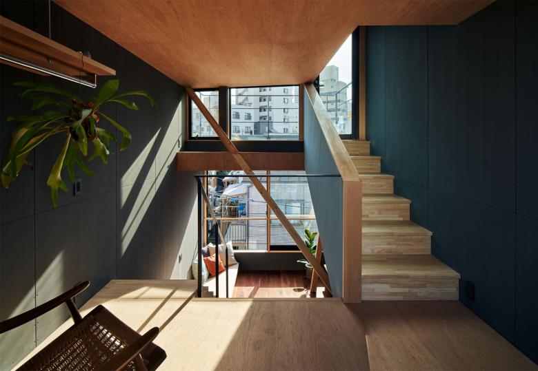 ここでは一帯に建ち並ぶ狭小住宅の類型からその骨格を再考する試みとした。建物間口3.0mを開放し、奥行6.3mの前後に緩衝帯となる小さな床を積層し、周辺に慎重に参加する構えとした。またズレた床の振れ止めとして水平力を負担する立体ブレースを配し、力学的に壁量の多い下階から立体ブレースが導くその先に、スカイツリーを望む。