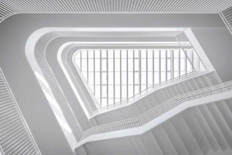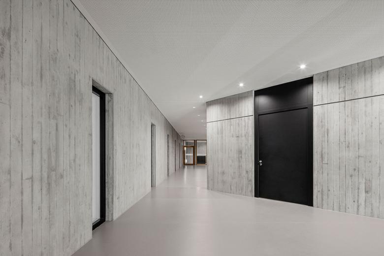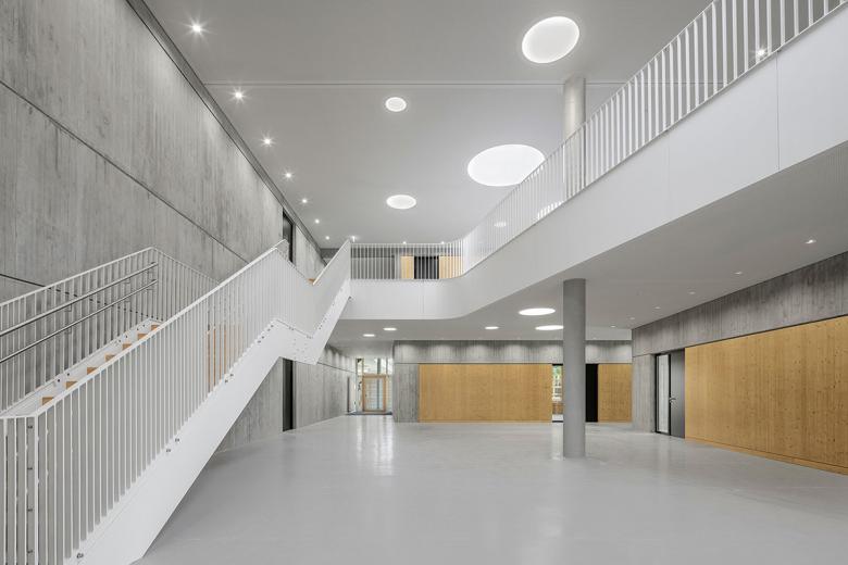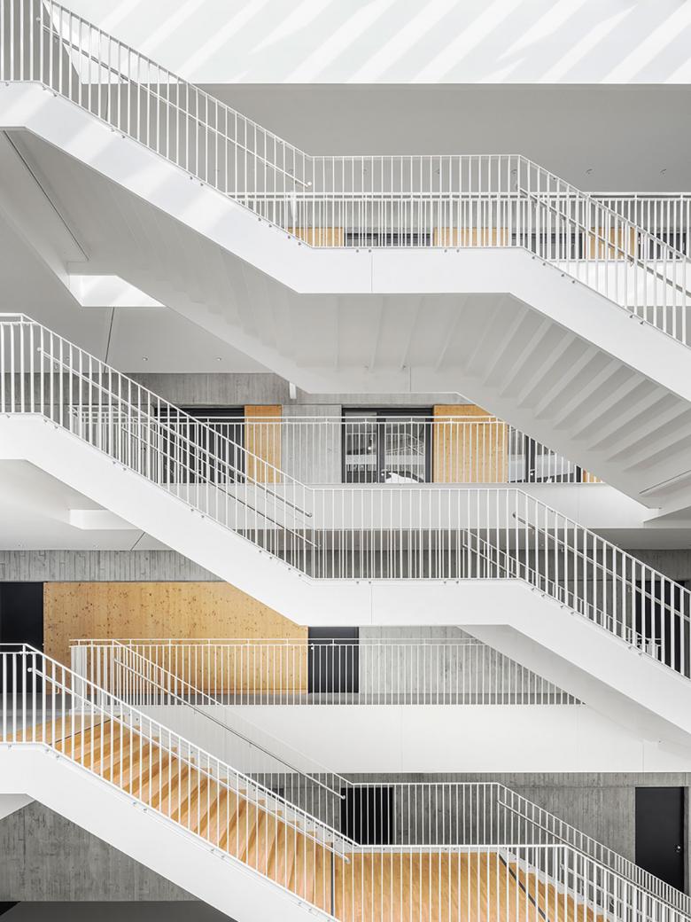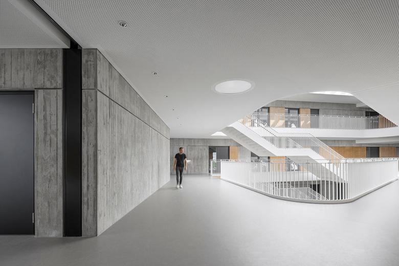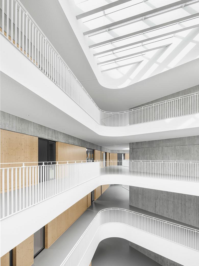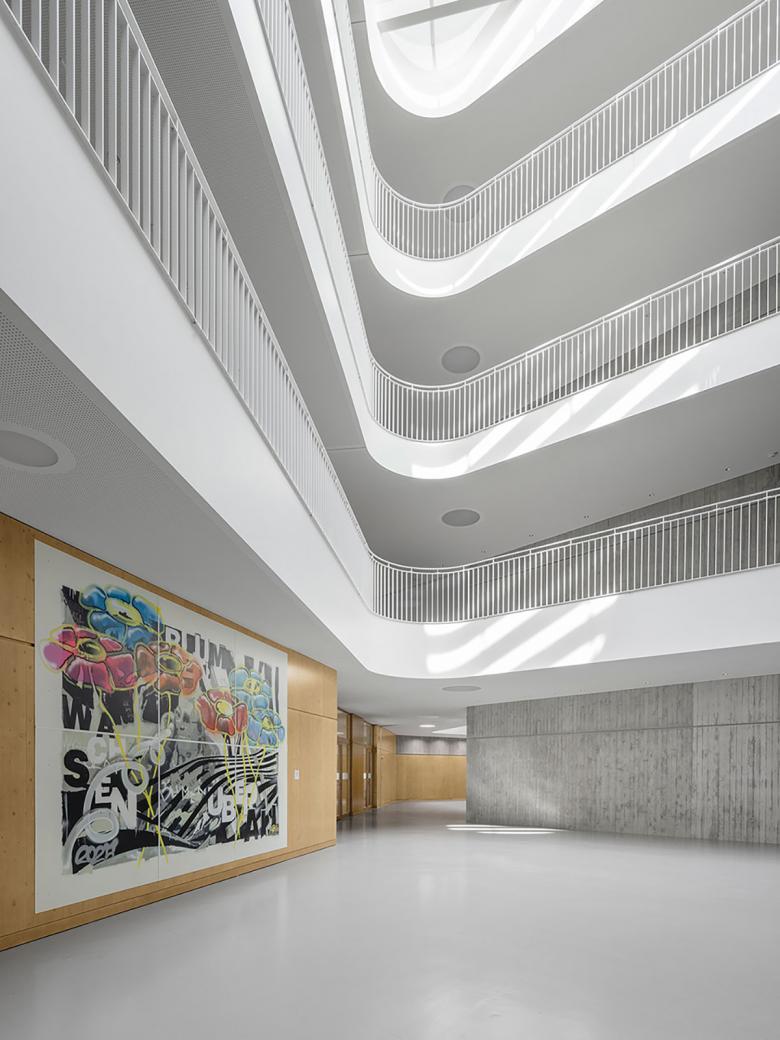 Die vier Jahrgänge befinden sich als zusammenhängende, überschaubare Cluster im dritten und vierten Obergeschoss. Erdgeschoss und erstes Obergeschoss nehmen die Ganztagesbetreuung und den Verwaltungs-/Lehrerbereich auf. Alle Geschosse sind räumlich über zwei viergeschossige Hallen miteinander verbunden, die Tageslicht in die Innenbereiche bringen.