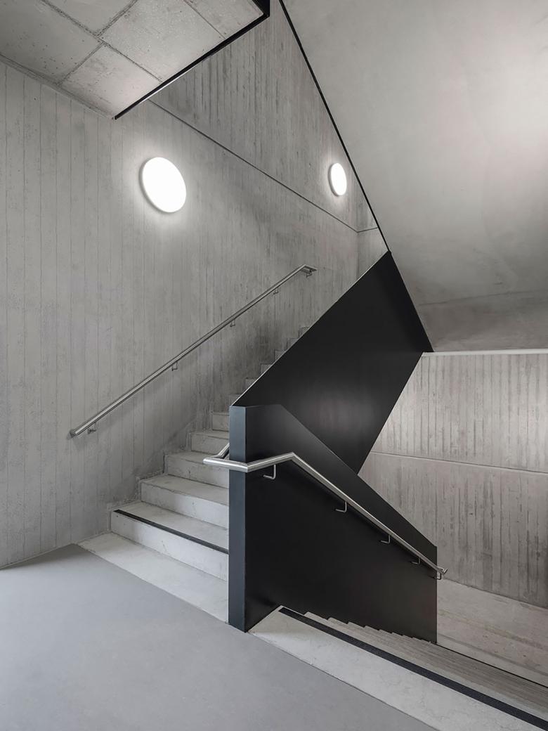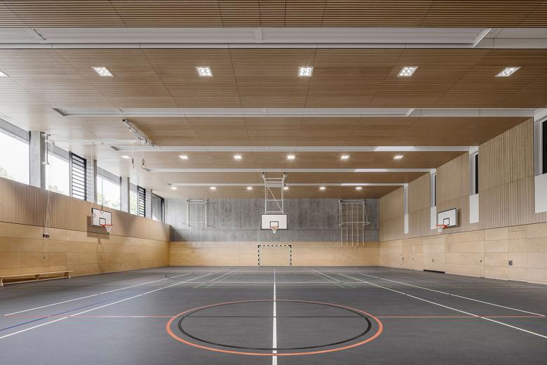 Die um ca. 3,50 m abgesenkte Sporthalle bildet als „grüner Sockel“ einen Übergang vom benachbarten Gleisfeldpark zum Gebäude. Sie ist erdgeschossig an die GTS angebunden. Eingangsbereich und Erschließungsgalerie bieten einen ungehinderten Blick auf das abgesenkte Spielfeld und die angrenzenden Außensportanlagen.