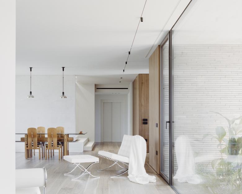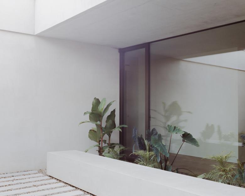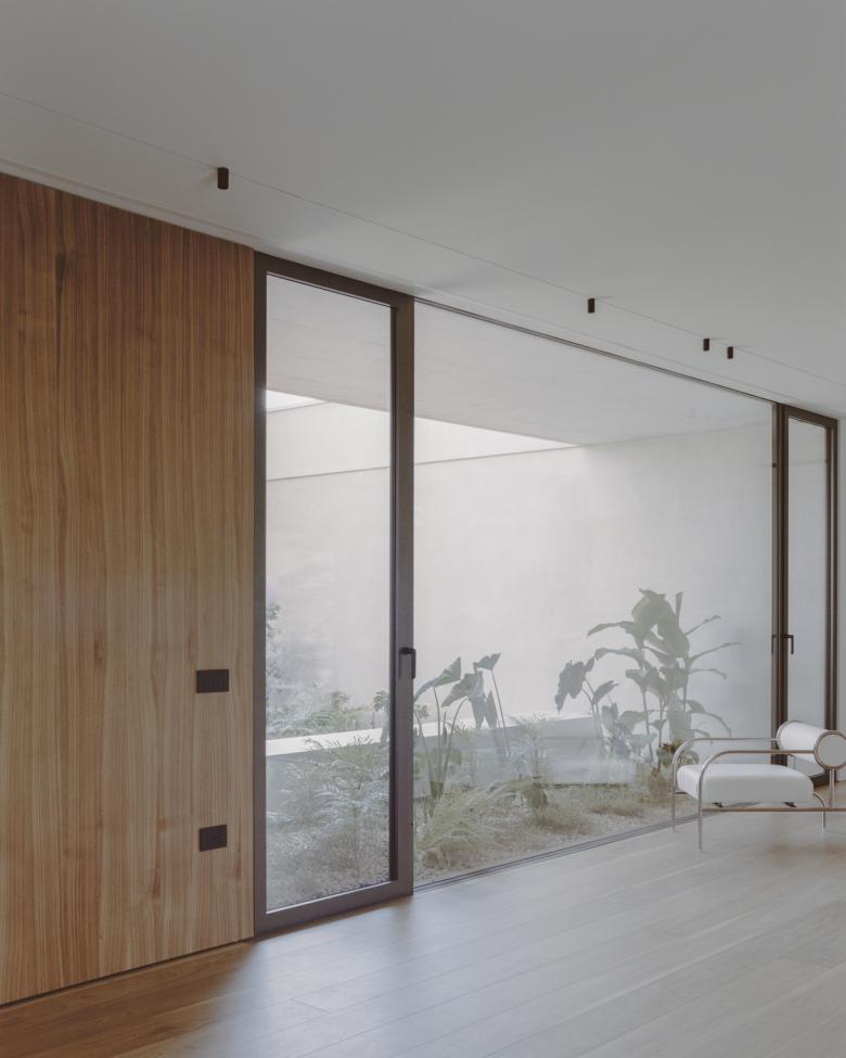 In tutto il progetto, vi è la volontà di intravedere oltre l’ambiente stesso in cui si è. Percorrendo gli ambienti si percepisce un tema di transizioni tra gli spazi, come quando dalla cucina si può intravedere il patio a nord, oltrepassando con lo sguardo il soggiorno, o come quando dal portico a est si può vedere il patio centrale della casa passando con la vista dalla cucina.