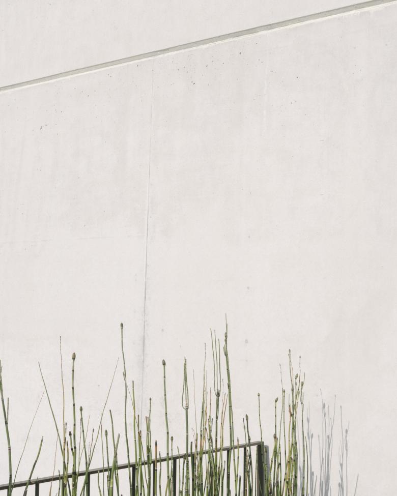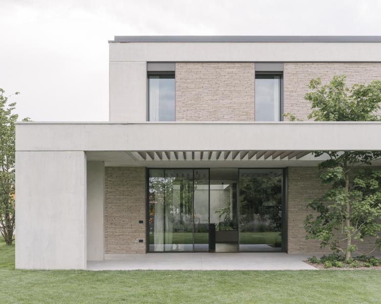 I materiali utilizzati nel progetto sono pochi ma importanti. I corpi principali della casa sono in calcestruzzo grigio liscio. A piano terra, tra gli appoggi, i muri appaiono in mattoni chiari di grande formato, posati quasi a secco e sono interrotti dai fori contornati da imbotti metallici color brun. I serramenti sono stati disegnati per mostrare solo il vetro nelle parti fisse, e lasciare la lettura solo delle porzioni apribili. A piano primo, nei lati est e ovest, viene ripresa questa alternanza di materiali tra le finestre delle camere.