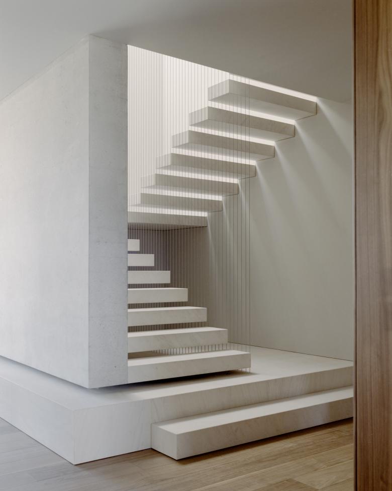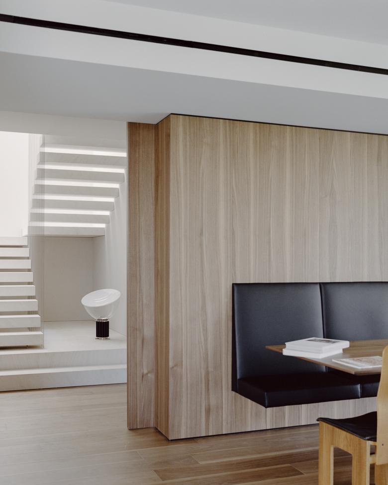 Internamente viene ripreso il calcestruzzo nel muro “sospeso” della scala, questa volta però declinato con una finitura levigata, che lascai affiorare delicatamente gli inerti. I pavimenti in noce si legano con ampie boiserie e porte scorrevoli che contrastano con le superfici grigio chiaro delle pareti.