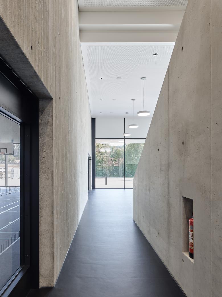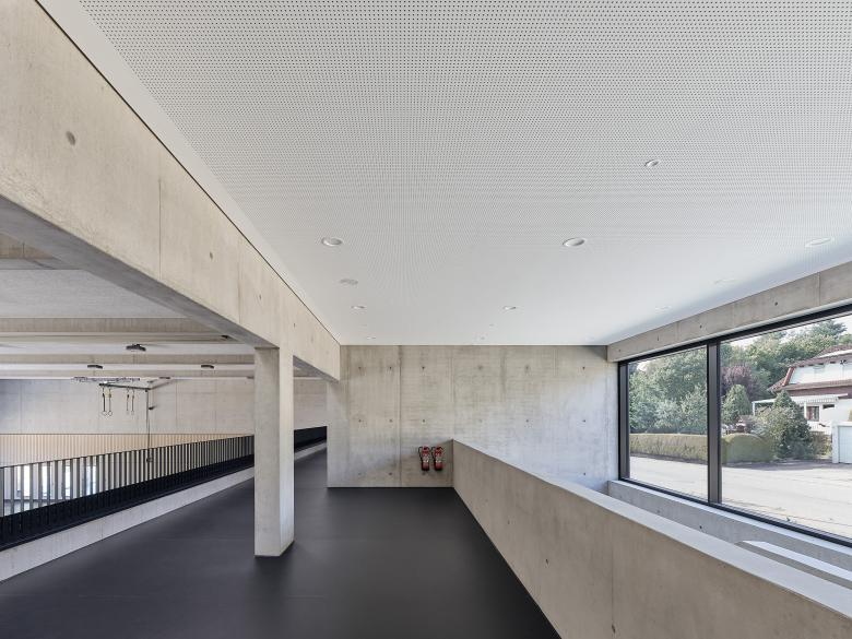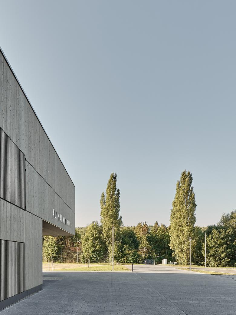 Die Stadt Lauchheim benötigte einen Ersatzneubau für die in die Jahre gekommene Alamannenhalle aus den 60-er Jahren. Die neue Mehrzweckhalle kompensiert durch seine straßennahe Lage den starken Höhenunterschied zwischen Straße und Jagstaue und schafft damit Platz für eine großzügige Fest- und Spielwiese entlang des renaturierten Flussufers. Zentraler Raum für große Veranstaltungen ist die 3-teilbare Halle, die über ein zweigeschossiges Foyer erschlossen wird. Für Veranstaltungen ist eine 80 qm große Klappbühne an der Stirnseite der Halle vorgesehen. Im Innenraum dominieren die Eigenfarben von Sichtbeton in Glatt- und Brettschalung als robuste langlebige Oberfläche in Kombination mit hell lasierten Fichteholzpaneelen. Der durchgängig schwarz gehaltene Linoleumboden wird außen mit dunklem Betonpflaster weitergeführt und verbindet somit den Innen- mit dem Außenraum. Die reduzierte Farbwahl eignet sich sowohl für Sport- als auch für Veranstaltungsnutzung.