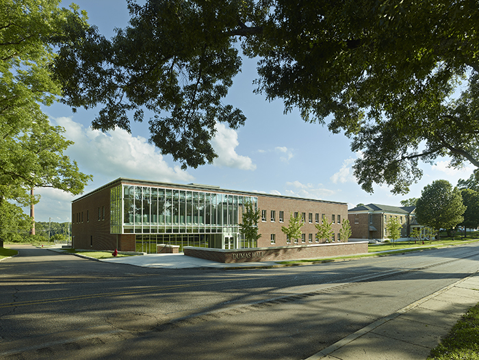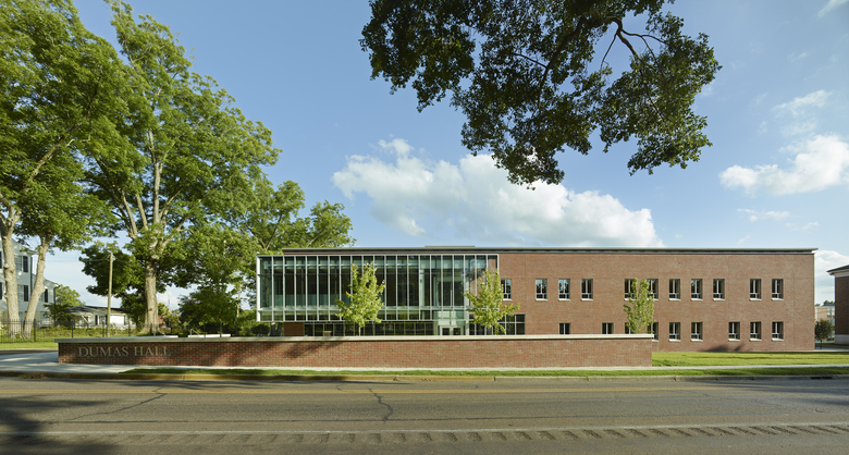 Dumas Hall has served as the university library, science building, and as a general classroom building. It is located along the eastern side of the center campus green, between the historic president’s house and chapel, and a porch-fronted row of two-story brick residence halls to the west.