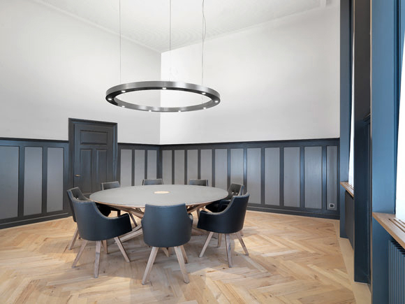 Das ehemalige Vereinshaus wird soweit möglich in seine Originalfassung von 1884 zurückversetzt. Hochwertige Materialien und stimmungsvolle Lichtkörper lassen den Eingangsbereich hell und einladend wirken. Der große Saal und die privatere Schlatterstube im 1. Obergeschoss können als multifunktionale Räume für Vorträge, Schulungen, Sitzungen, Filmvorführungen und für elegante Diners genutzt werden. Im zweiten Geschoss sind Büroräumlichkeiten eingerichtet; zwischen den Balken des mittelalterlichen Dachstuhls entsteht ein stimmiger Konferenzsaal. Der Hofbereich wird zum Ort der Begegnung und kann für Apéros oder als Pausenplatz genutzt werden. Die wenigen Sitzgelegenheiten und die schlichte Begrünung machen den Hof als solchen wieder erlebbar.