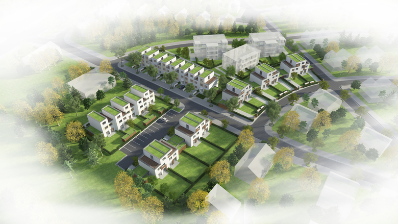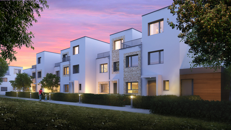 Ein architektonisch eigenständiges Esemble aus Ein- und Mehrfamilienhäusern bildet den städtebaulichen Auftakt für die Entwicklung des nördlichen Abschnitts im Offenbacher Baugebiet An den Eichen in Waldheim-Süd.