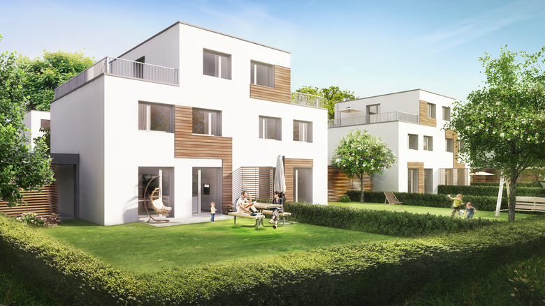 Für die einzelnen Baukörper hat Franken Architekten ein Konzept erarbeitet, welches unterschiedliche, individuelle Angebote an Grundstücken und Haustypen schafft und Grün- sowie Erholungsbereiche herstellt. Für die fünf Grundstücke wurde eine abwechslungsreiche, aber formal ähnliche Gestaltung geschaffen. Diese zeichnet sich durch kubische Baukörper aus, die durch Staffelgeschosse rhythmisch gegliedert und in der Vertikale differenziert werden. Die Mehrfamilienhäuser nehmen die Grundform der Doppelhäuser skaliert auf und fügen sich so gut in die Gesamterscheinung ein. Die hochwertige Ausführung erfolgt in Putzoberflächen mit strukturierenden Ziegel- und Holzelementen, die jeweils Gebäudegruppen zusammenfassen. Die Freiraumgestaltung schafft einen homogenen Übergang zwischen privaten und öffentlichen Flächen.
