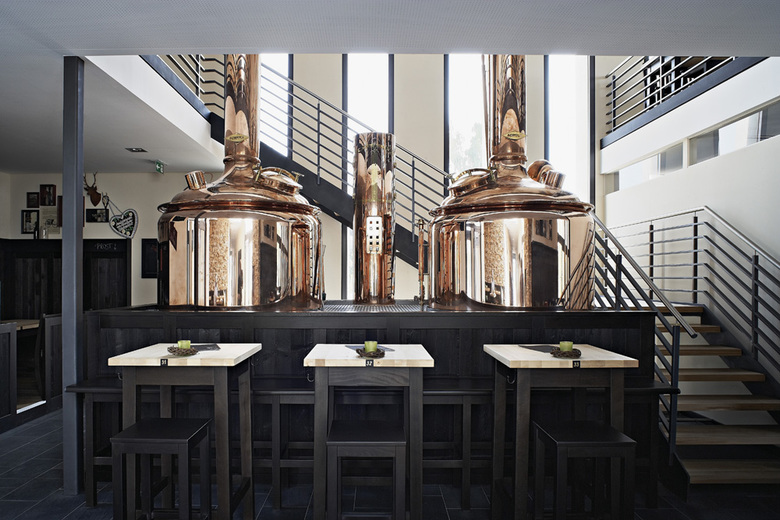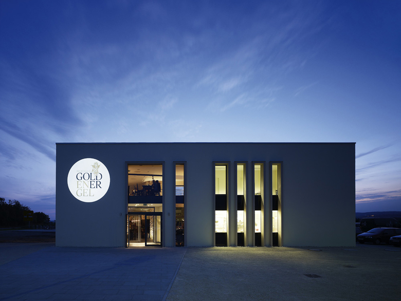 Für das erste Brauhaus in der „Rotweinstadt“ Ingelheim wurde die Marke Brauhaus "Goldener Engel" mit ausdrucksstarker räumlicher Gestaltung im Spannungsfeld zwischen dem Erhabenen der Sakralarchitektur und dem Profanen der Braukultur, gleichzeitig zwischen Tradition und Moderne, entwickelt. Schlitze in der Fassade werden nach einem regelbasiertem Prozess platziert und als Reminiszenz an die lokale Bauweise durch massive Gewände eingefasst. Die Fassade kann als Partitur eines Musikstücks gelesen werden, in dem die Tonhöhe durch die Schlitzhöhe, die Tonlänge durch die Schlitzbreite und der Rhythmus durch die Schlitzabstände definiert wird.