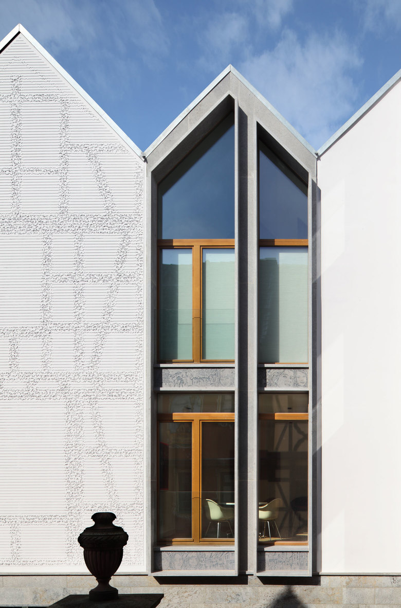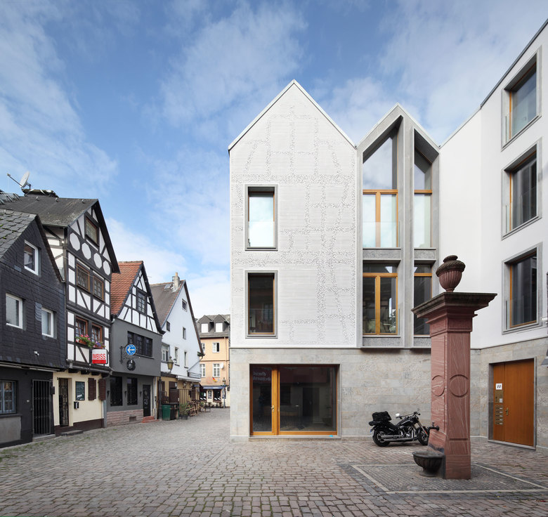 In der Fassadengestaltung wird die von Franken Architekten entwickelte Strategie des Nachbildes angewendet. Bei langer Betrachtung eines Objektes wird beim Schließen des Auges ein Phantombild auf der Netzhaut erzeugt. Dieses unscharfe Bild verblasst nach einiger Zeit. Bei jeder Rekonstruktion, wie beispielsweise auch bei der Dom Römer Bebauung in Frankfurt, wird lediglich ein Bild einer Vergangenheit erzeugt, die umso unschärfer wird umso näher man sie betrachtet. Aus dem Aufmaß des konstruktiven Fachwerks des Vorderhauses wurde eine Zeichnung angefertigt. Ein digitaler Algorithmus erzeugt einen parametrischen Zitterstrich immer an den Stellen, an denen einstmals Fachwerkbalken saßen. In der Fernwirkung erscheint durch den verdichteten Schwarzwert das Fachwerk als Andeutung um sich bei Annäherung in abstrakte Zitterstriche aufzulösen. Die Putzfassade lässt so das Fachwerk des Ursprungsbaus als „Nachbild“ durch eine maschinelle Fräsung wiederauferstehen, welche erst im Licht als Schattenriss erkennbar wird. Diese Reminiszenz an das alte Gebäude stellt einen subtilen und zeitgemäßen Umgang mit dem Genius Loci und mit dem Thema Rekonstruktion dar.